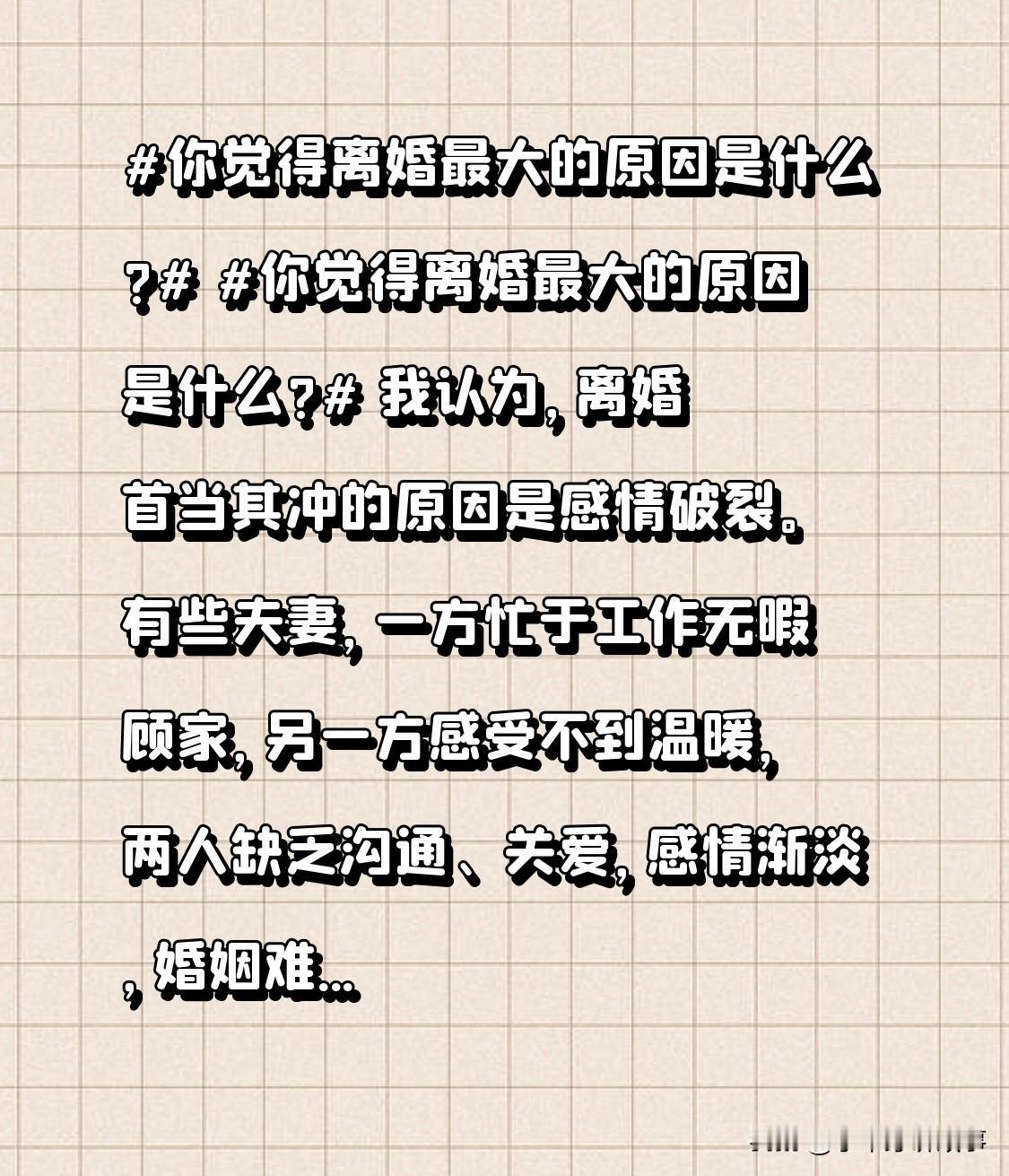 你觉得离婚最大的原因是什么? 你觉得离婚最大的原因是什么? 我认为,离婚首当其冲的原因是感情破裂。有些夫妻,一方忙于工作无暇顾家,另一方感受不到温暖,两人缺乏沟通、关爱,感情渐淡,婚姻难以为继。 性格不合也影响巨大。急性子与慢性子在处事和生活习惯上难协调,小矛盾积累成大冲突。 而出轨严重践踏婚姻忠诚,伤害极大,常致婚姻破裂。 此外,家庭琐事、经济、婆媳关系等也是导火索,多因素交织让婚姻走向尽头。