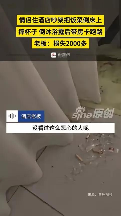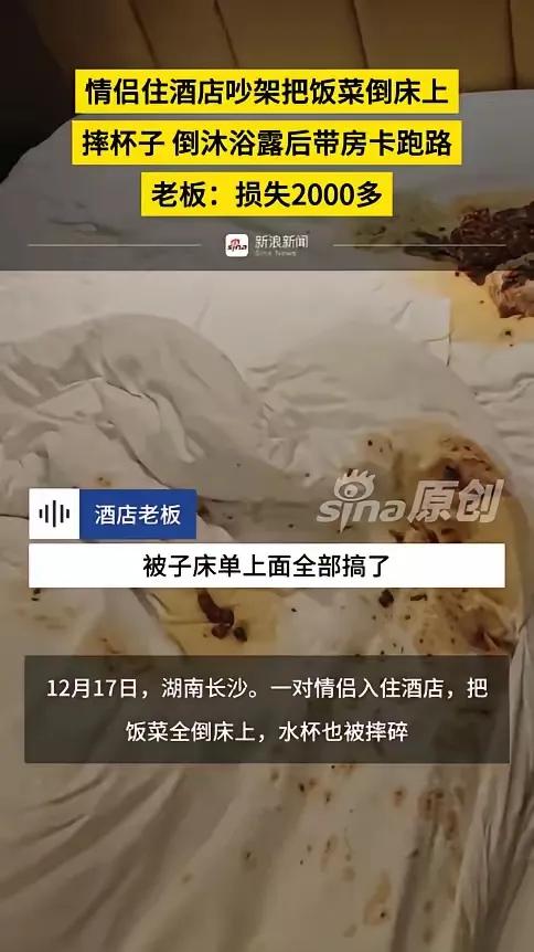这是两个什么样的玩意?做事如此冲动,不过脑子,他们以为这样就能够逃脱惩罚吗?想的太愉快了! 前几天,一对年轻情侣入住酒店。当天,两人先后离开酒店,连房卡都没有退。待服务员来到房间查看时,才发现房间内被这两人搞得乱七八糟,吃剩的饭菜倒得满床都是,浴室里的沐浴露挤得到处都是,房间一片狼藉!酒店负责人称,粗略评估了一下他们的行为给酒店造成的损失大概2000元左右。 据称,这两人是因为在房间内吵架了,所以盛怒之下才做出这种不理智的举动。怎么样?他们都将为自己无知和粗鲁的行为付出代价。 搞笑的是,两人以为拿着房卡逃跑了,就没有人能够找到他们,他们也不想一想自己住房间之前必须要在酒店前台登记个人信息,就凭这,你往哪里跑? 跑是跑不掉的,最好的办法就是回来向酒店承认错误,尽量获得酒店的原谅,然后造价赔偿酒店的所有损失,这就是最好的结果了。 作为成年人,必须要为自己的莽撞行为买单。