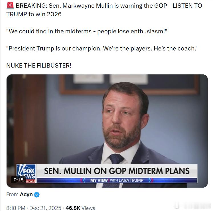 联邦参议员马克韦恩·穆林向共和党发出警告——要想赢下 2026 年,就要听特朗普的!“我们可能会在中期选举中发现——人们的热情正在消退!”“特朗普总统是我们的冠军,我们是上场的球员,他是教练。”彻底废除冗长辩论(核选项)!