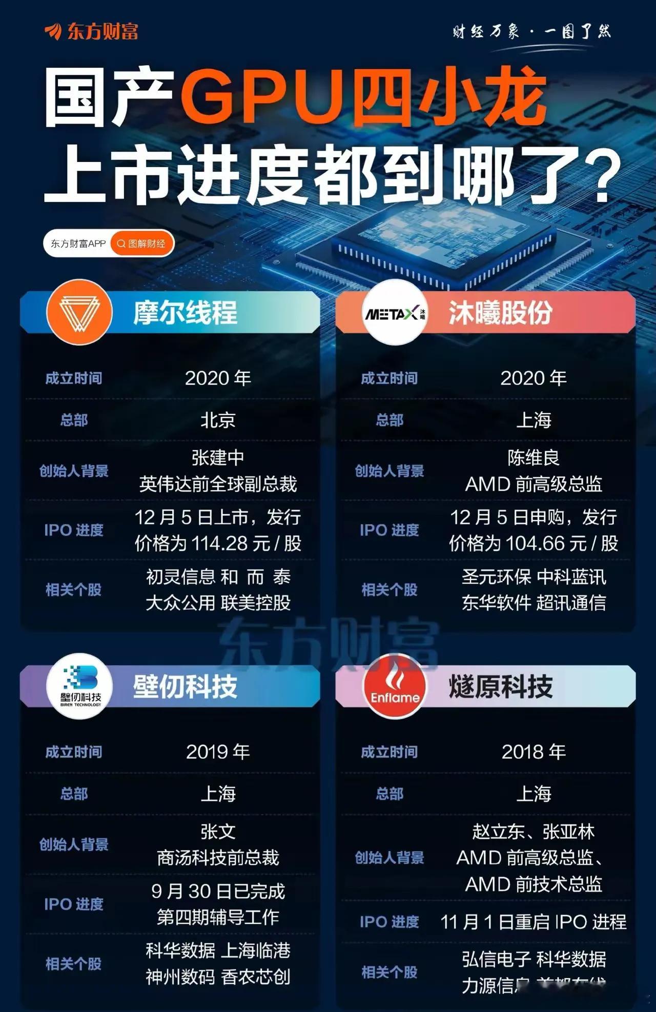国产GPU四小龙上市进展:摩尔线程,A股上市 市值:3121亿元沐曦股份,A股上市 市值:2863亿元壁仞科技icon,港股上市 即将上市燧原科技,IPO进程处于上市辅导阶段。