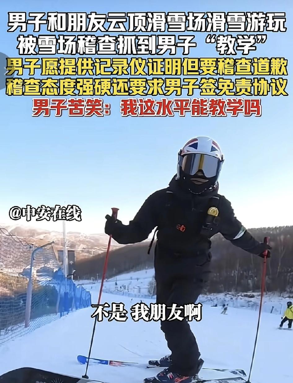 河北张家口一男子与朋友在某雪场游玩时,被场地的稽查人员抓到疑似在教学,虽然男子。有解释,但是最茶园还需要男子提供视频证据并道歉。两者争执过程中,稽查员要求男子签免责协议。男子哭笑不得,自己这样的水平根本就不可能教学,只是过来游玩。
