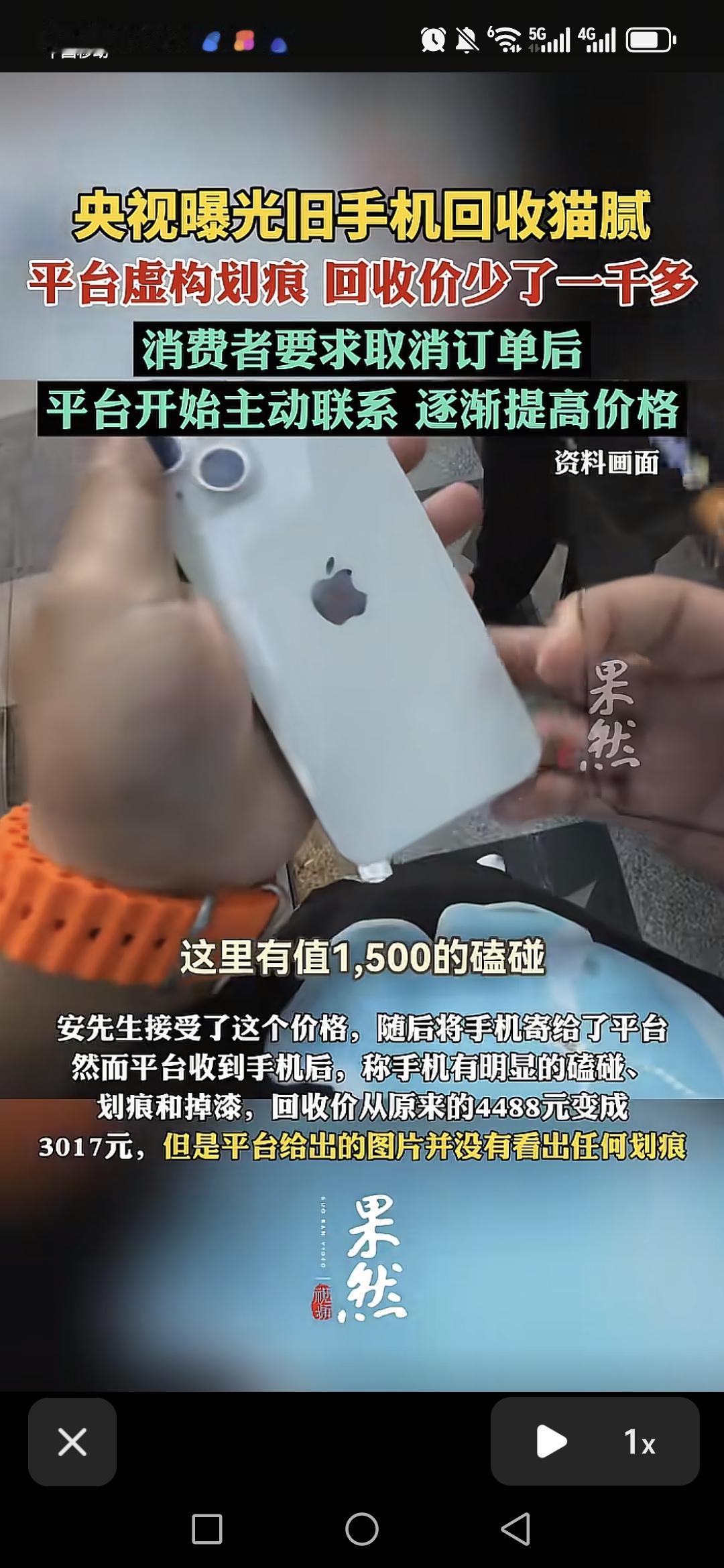 辽宁大连一位网友称自己通过二手平台以旧换新购买手机,把旧手机以4488元的价格回收,但是品平台收到手机之后发来一张照片,说手机有刮痕,价格砍掉到3200块但是男子确认自己手机是没有任何刮痕的,让人想不到的是平台后来主动联系网友一次性的假价格,最终还同意以原来的价格回收,但是男子坚决要退回手机。网友质疑平台在虚构刮痕,降低价格回收。