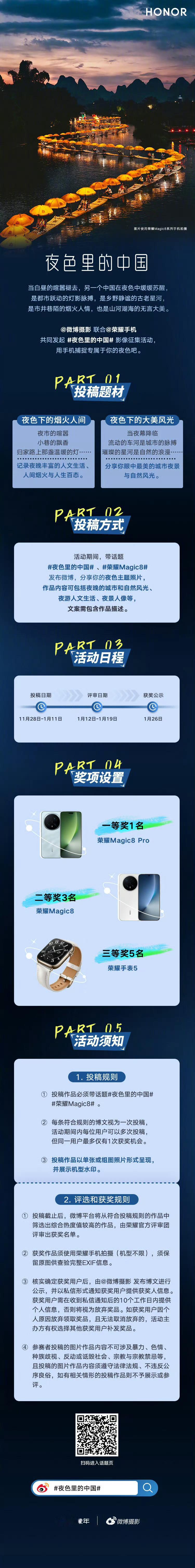 26年1月11日前❗️带话题夜色里的中国荣耀Magic8,在微博分享你使用荣耀手机拍摄的夜色主题照片,将有机会赢取超夜神手机Magic8 Pro等好礼。
