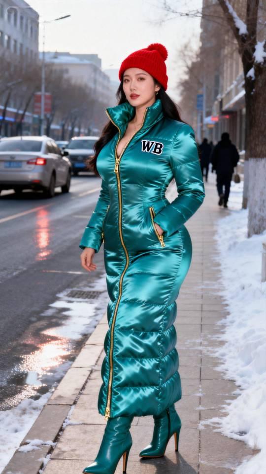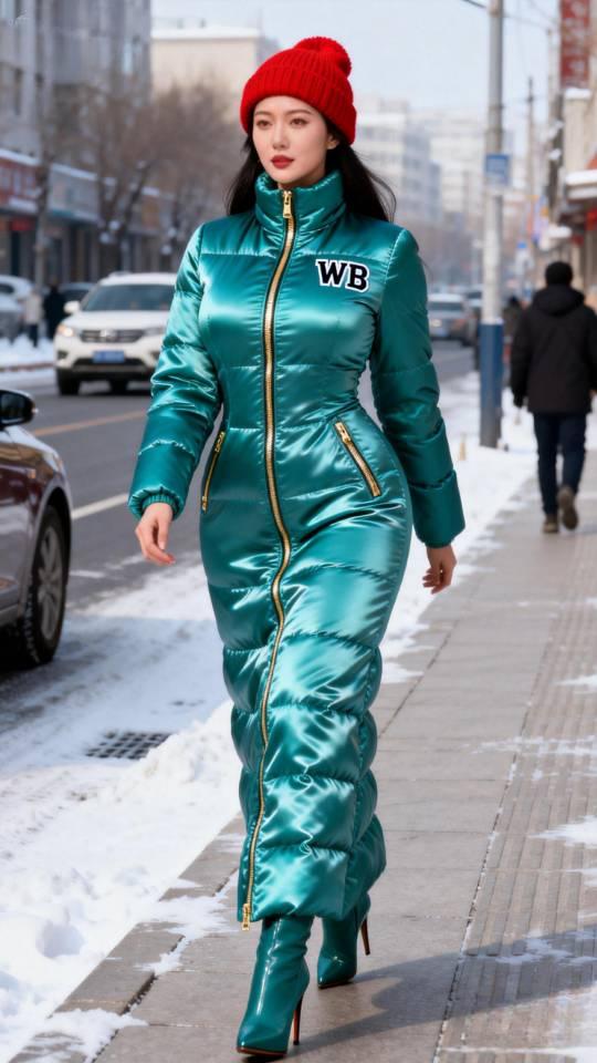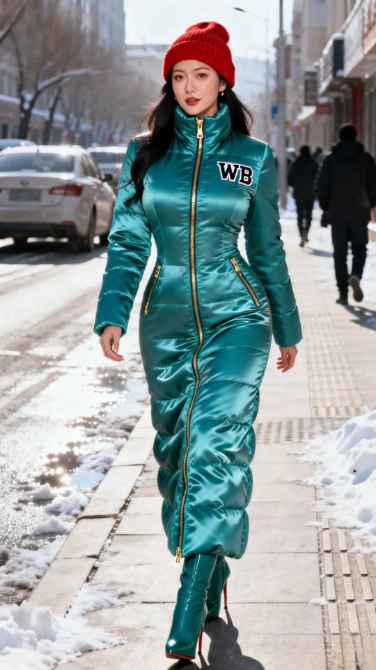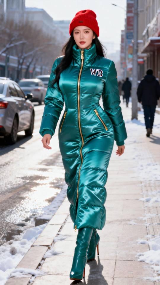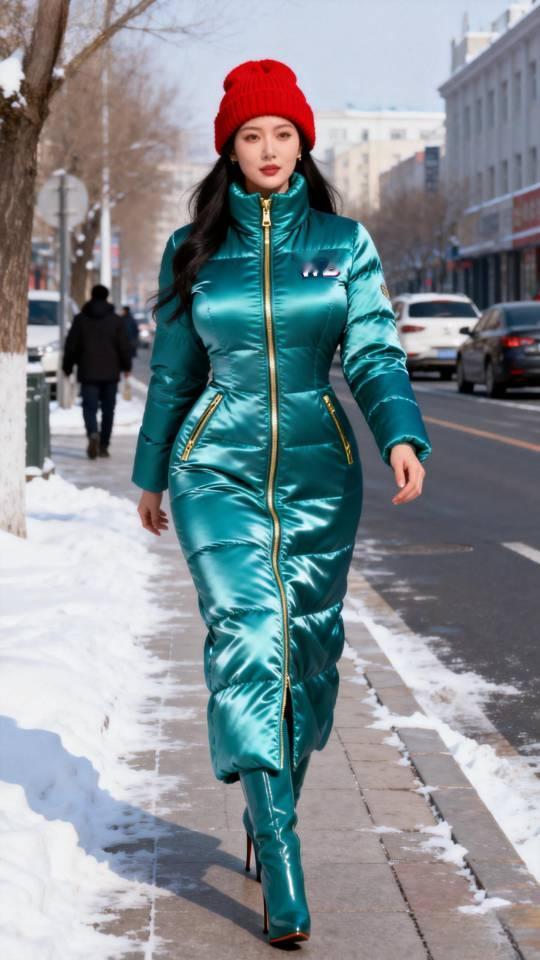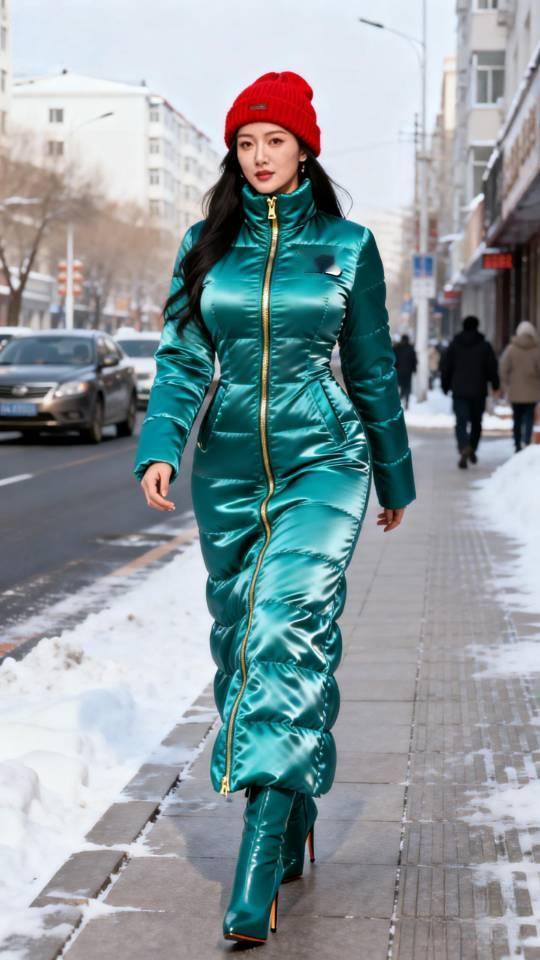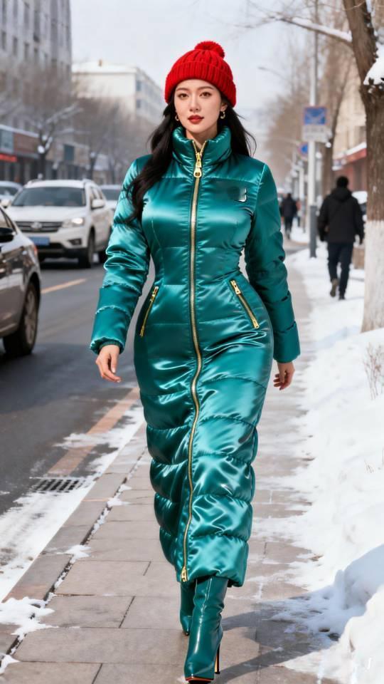 走在大街上的青色羽绒服女子。羽绒服 高清美女
