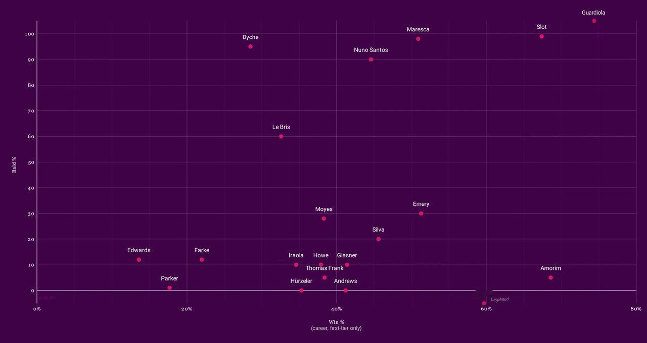 秃头会影响英超主教练的胜率吗?用趣味图表为你解读并非所有光头主帅都是“水货”! 进入圣诞赛程的2025/26赛季英超,依然保持着世界第一竞争激烈联赛的名声。阿森纳目前领跑积分榜,但仅领先争冠对手曼城2分,也只比阿斯顿维拉多出3分! 瓜迪奥拉正率领曼城向又一座英超冠军发起冲刺,同时也在巩固自己“历史最强光头主帅”的声誉。事实上,在目前所有英超主帅中,瓜迪奥拉在联赛执教生涯的胜率(仅统计联赛)高居光头主帅榜首。 在这张趣味图表中,瓜迪奥拉获得了“超过100%”的秃头指数,而其执教生涯的联赛胜率也超过70%。另一位光头主帅——曾带领利物浦赢得2024/25赛季英超冠军的斯洛特,同样获得100%秃头评级,其执教顶级联赛的胜率也超过60%。 切尔西主帅马雷斯卡同样顶着100%光头指数,职业生涯执教顶级联赛球队的胜率约为50%。而被标记为“秃头指数低于0%”的阿尔特塔,胜率却接近60%;阿莫林的胜率更是达到了65%(葡超成绩加成)!