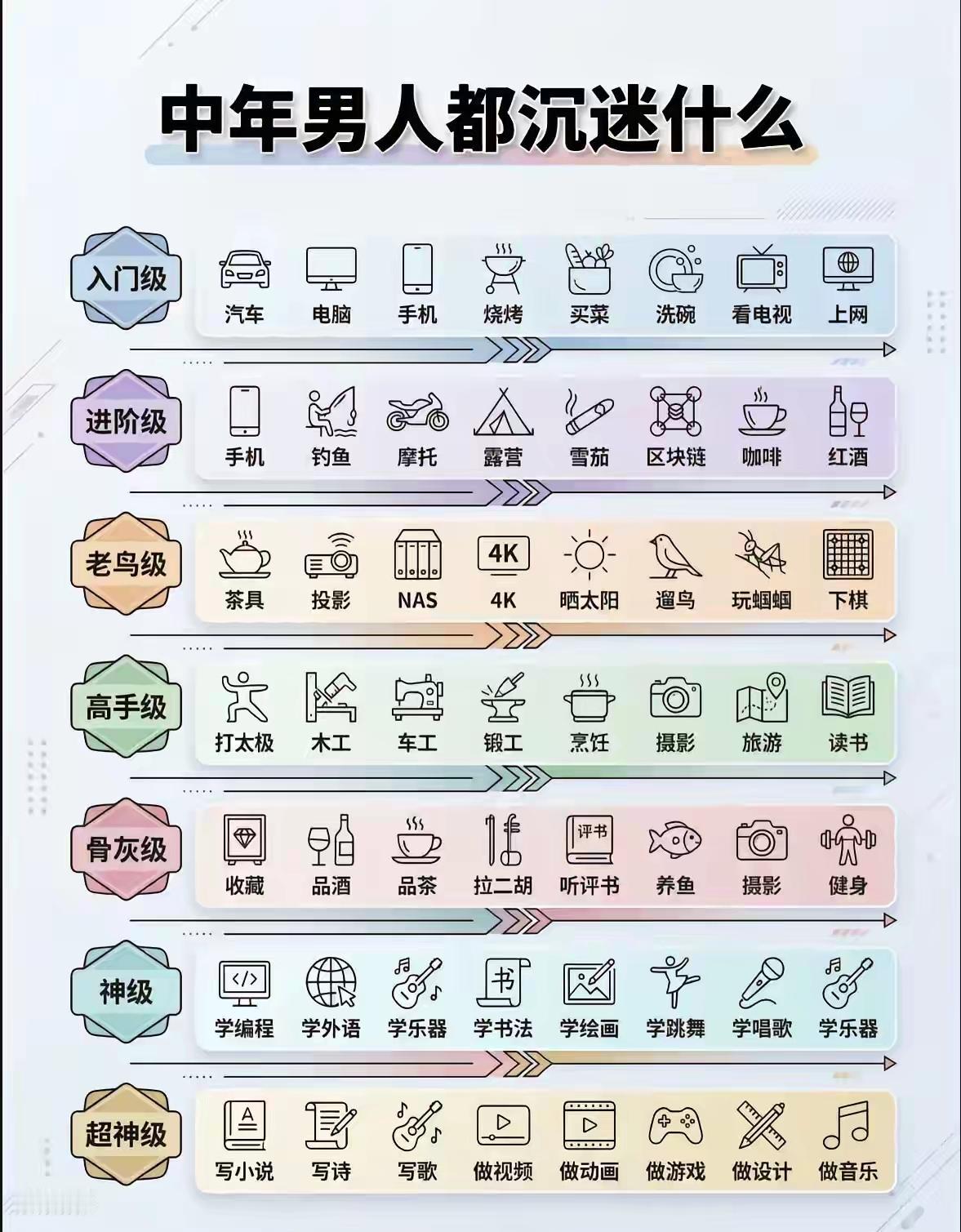 男人们现在都在沉迷什么,爱好是变了又变 我四十多了,经历过打牌养花养鱼,钓鱼茶具,下棋盘串,品茶品酒,打乒乓球羽毛球,曾经玩电脑游戏刷抖音,为了方便专门买的竖屏显示器。 现在的超神级别爱好只有一个,那就是喝茶晒太阳,目前是晒太阳高潮阶段,像这个季节天气好的话,可以搬个板凳坐在太阳下什么都不干,能坐一下午,已经不依靠外物回归内心了。