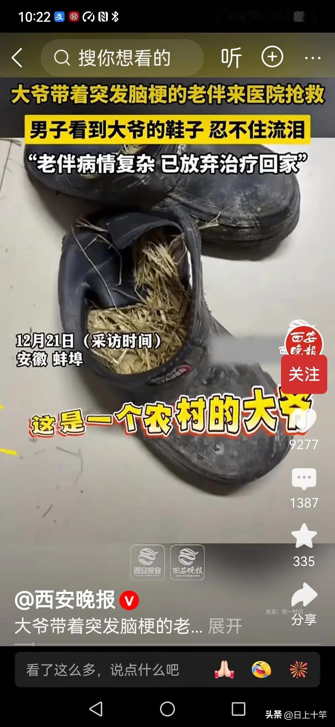 我看到这篇新闻。第一反应就是……? (个人观点仅供参考,无任何不良引导) 这双塞满稻草的破胶鞋,怎么看都像是从旧时代走出来的“遗物”,可它却真实地穿在安徽蚌埠一位农村老汉的脚上。不是为了博眼球,也不是故意寒酸,而是因为——他把能省的每一分钱,都花在了老伴的病上。 老汉把家里的积蓄掏得干干净净,亲戚朋友能借的也都借遍了,只为让老伴多撑一天是一天。可现实有时就是这么残酷,病情复杂、费用高得像一座山,最终还是只能无奈地放弃治疗,把老伴接回家。那一刻,他的背影比冬天的风还冷。 说句心里话,我看到那双鞋的时候鼻子是真的酸了。那不是一双鞋,那是一个老人在生活重压下的坚持,是对妻子的深情,也是许多农村家庭面对大病时的真实困境。我们总说“久病床前无孝子”,但在这位老汉身上,我看到的是“再穷也不放弃你”。 如果换成是我们的父母,谁能忍心让他们穿这样的鞋?谁愿意让他们在寒风里靠稻草取暖? 你觉得,农村家庭面对大病时,最缺的是什么?是更完善的医疗保障?还是更有力的社会救助?欢迎在评论区聊聊你的看法。