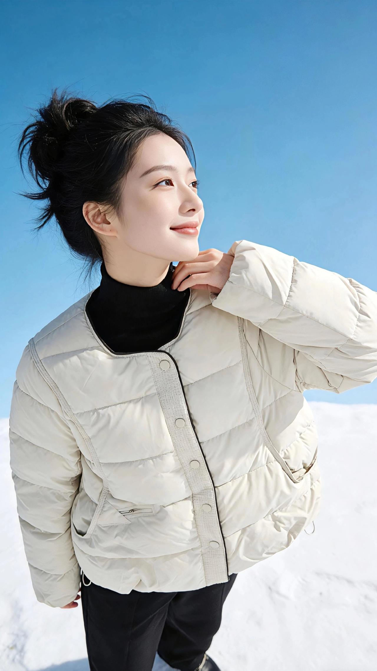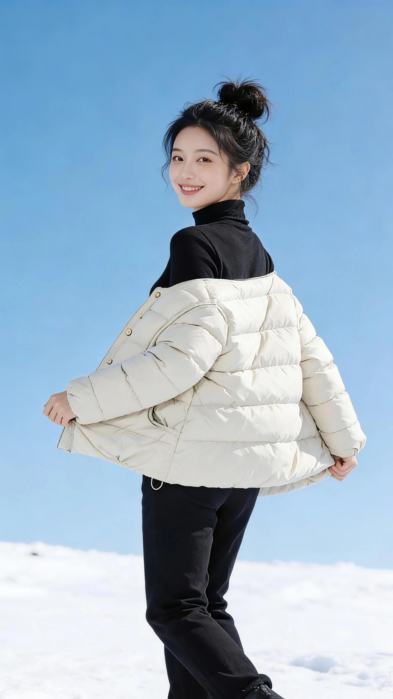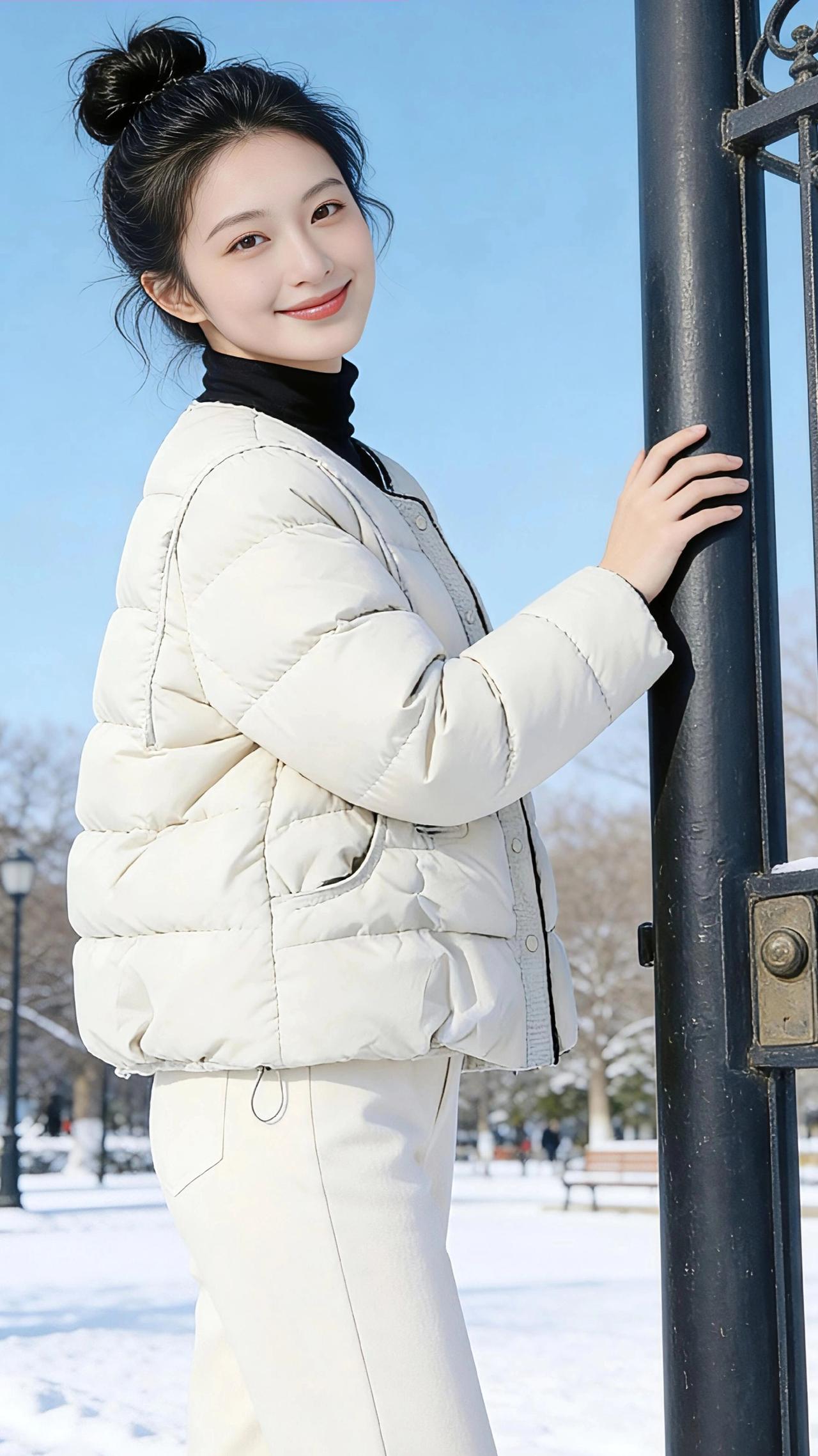 暖白棉服的冬日絮语 澄澈的蓝天把冬日的光揉得透亮,雪裹着大地铺成一片柔软的白,风掠过的时候,带着清冽的凉,却被身上这件暖白棉服轻轻兜住了。 她扎着蓬松的黑色丸子头,碎发被风拂得微微翘起,像沾了雪的蒲公英。暖白棉服的蓬松质感,中和了冬日的冷硬,内搭的黑色高领又添了几分利落,黑白相撞的简约,在雪地里漾出温柔的层次感。 比心的指尖弯出清甜的弧度,扶着铁艺栏杆时,手背蹭到微凉的金属,笑意却依旧暖融融的;抬手拢发的瞬间,棉服的袖口滑下,露出一截纤细的手腕,与漫天白雪相映。蹲下身捧起雪的那一刻,掌心的白与天地的白相融,她仰头笑时,眼里盛着的,是比蓝天更澄澈的欢喜。 转身时棉服的衣摆轻轻扬起,像一只慵懒的白色蝴蝶,在雪地上蹁跹。这抹暖白,不是冬日的沉闷,而是裹着温柔的小太阳,把凛冽的冬,熬成了一段软糯的絮语。 高级感穿搭 小个子穿搭 冬季穿搭 棉服
