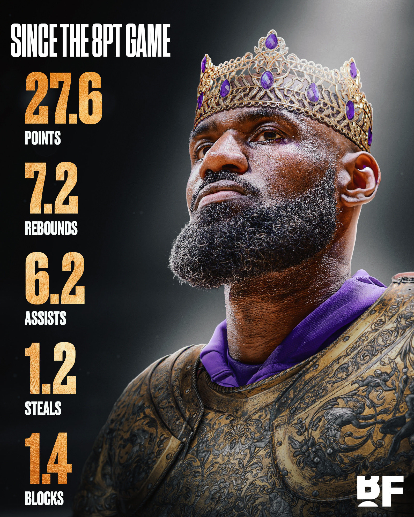 8分那场之后老詹场均27.6分7.2篮板6.2助攻1.2抢断1.4盖帽。NBA