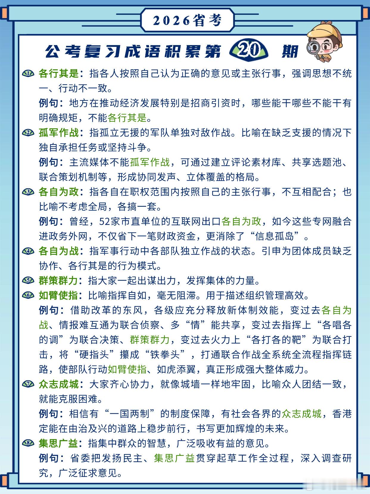 26省考成语积累第20天各行其是 孤军作战 各自为政 各自为战群策群力 如臂使指 众志成城 集思广益开学元气加油站决战公考国考省考
