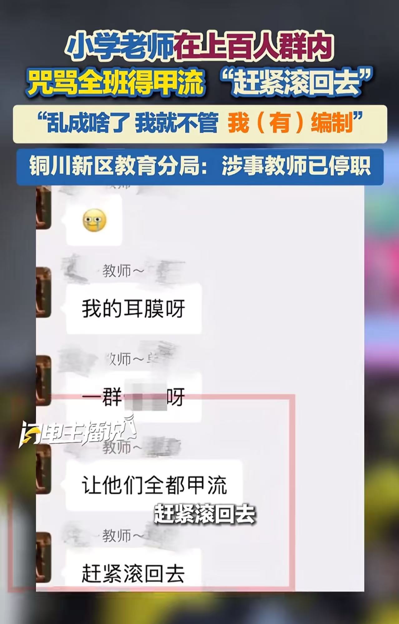 网传聊天记录显示,这位老师毫不客气地在群里发泄着不满:“我的耳膜呀,一群XXX,让他们全都甲流,赶紧滚回去。”