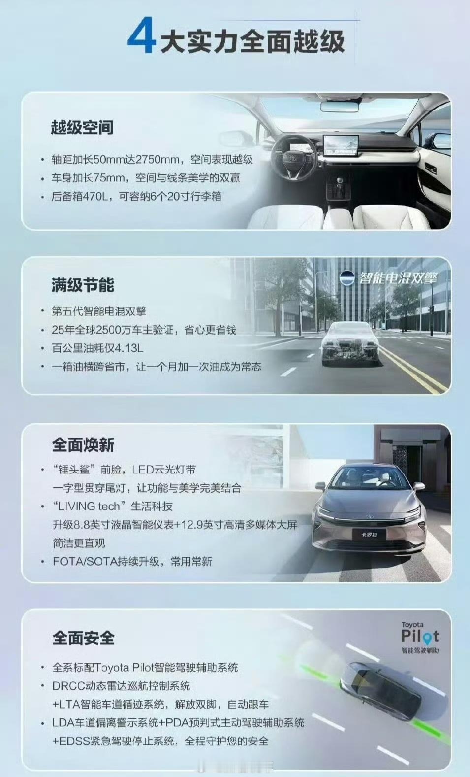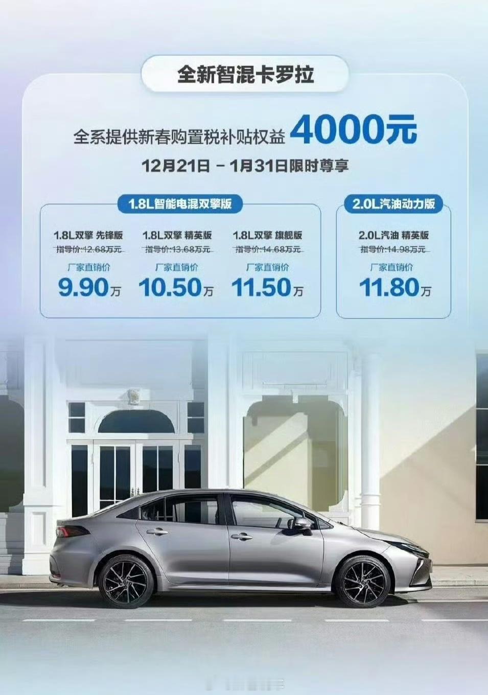 新款一汽丰田卡罗拉上市新款卡罗拉混动改动全面升级且价格大幅下探,厂家直销9.9万起,叠加补贴落地9万级,较旧款近乎腰斩。轴距加长50mm至2750mm,空间媲美B级车;升级第五代智能电混系统,油耗低至4.06L,满油续航超1200km。新增2.0L燃油版,全系标配L2级智驾与大尺寸中控屏,外观年轻化,智能与实用性双提升,性价比拉满。