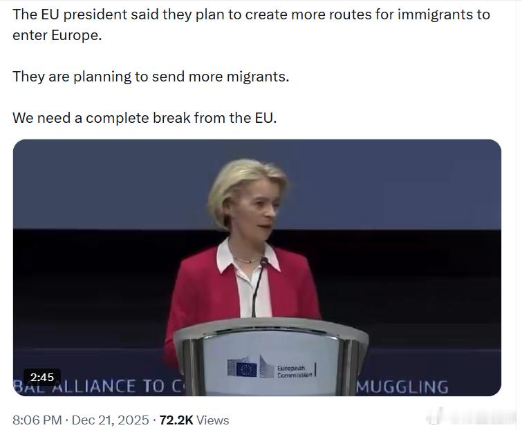 欧盟主席表示,他们计划为移民进入欧洲创造更多途径。他们计划送更多移民过来。必须解散欧盟这个组织。