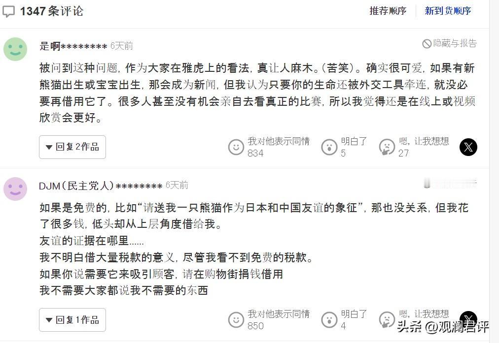 关于终止熊猫租借,日本网民的反应: 1、即使没有熊猫,对客流量影响也不大; 2、租借不是赠予,体现不了友谊; 3、与其花重金租借熊猫,不如把这些钱用于民生; 4、熊猫不应该被政治化。