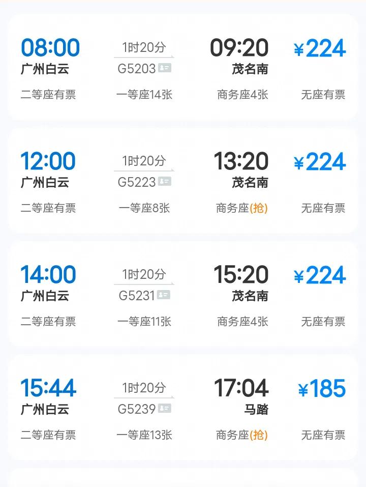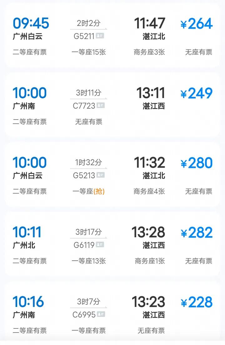 喜讯,广州途经茂名至湛江时速350公里的广湛高铁已于今天(12月22日)正式开通,广州白云至湛江北站(6台12线高架站房)最快的G9785次高速动车组全程运行时间为1小时32分,票价约280元,广州白云站到茂名南站最快的为G5203次列车,发车时间为8点整,到达时间为9点20,全程运行时间为80分钟,票价为224元,相比过去走时速200的深湛铁路票价虽然稍微高一点,但更加节省时间,广湛高铁全长约401公里,起于广州站,沿途主要途经佛山、阳春、茂名、湛江等地,广湛高铁的开通将大幅缩短的广州来往粤西地区的时间,沿途各城市区县之间来往也更加方便,具体信息以官方和实际为准。