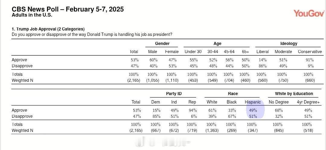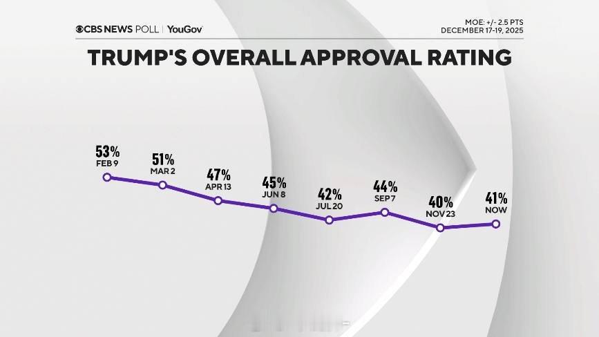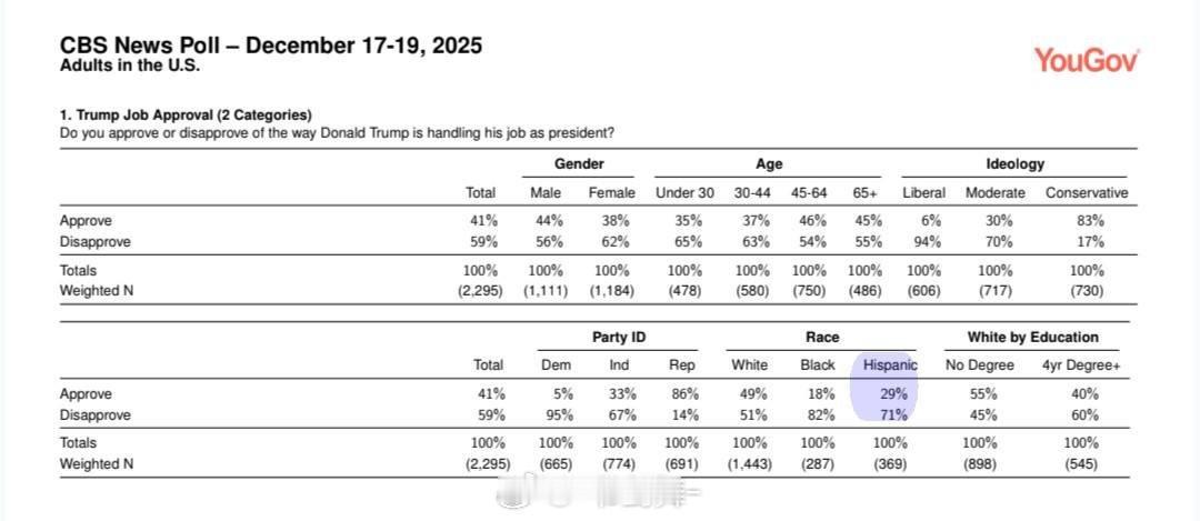 哥伦比亚广播公司新闻全国民调特朗普支持率支持:41%(+1)不支持:59%(-1)🏌️♂️特朗普在关键议题上的净支持率移民:-9经济:-26通胀:-32🏌️♂️特朗普的政策让你的财务状况……变得更好:18%变得更糟:50%保持不变:32%🏌️♂️特朗普在西班牙裔群体中的支持率变化2月支持:49%(-2)不支持:51%12月支持:29%(-42),创下新低不支持:71%净变化:下降40个百分点YouGov|12月17日至19日|2300人样本海外新鲜事