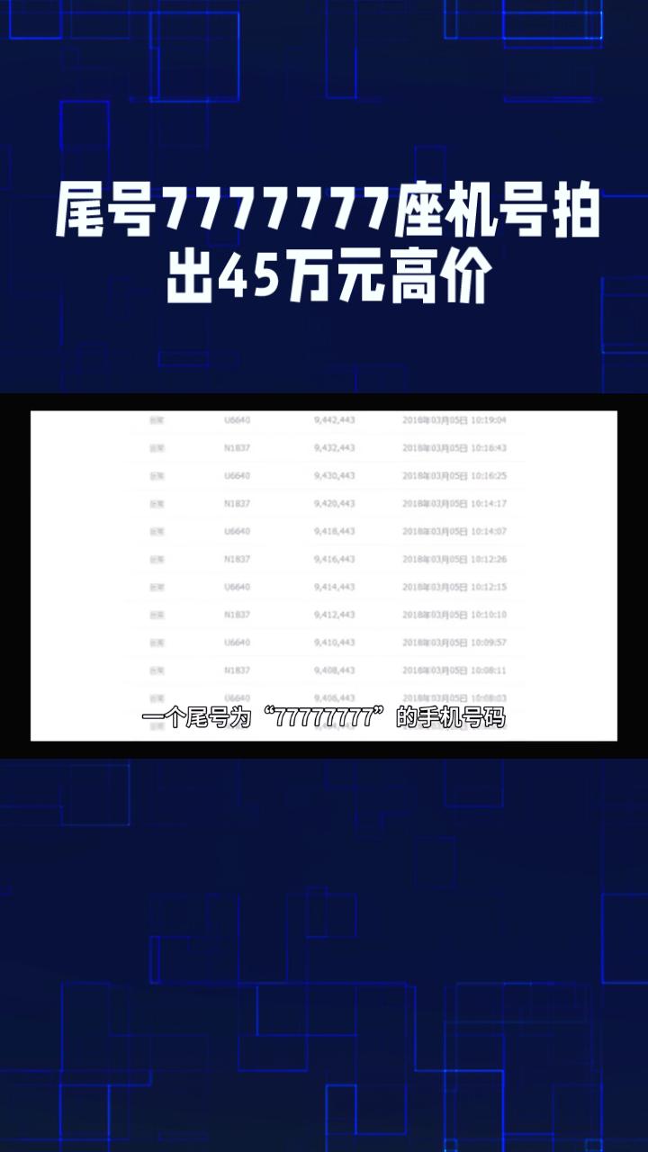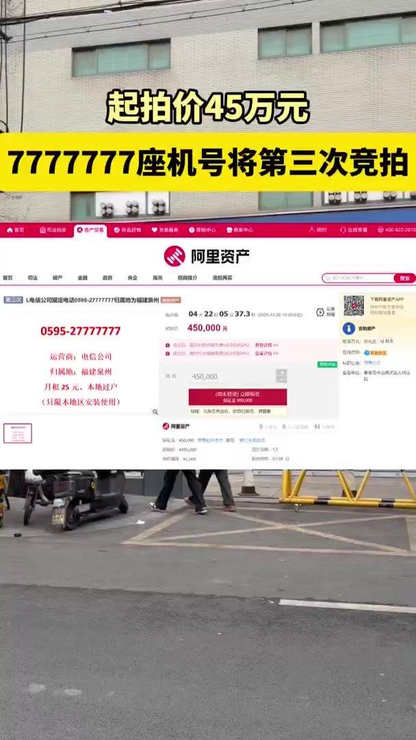 尾号7777777座机号为何能拍出45万元的高价?这背后隐藏着怎样的商业价值? 近年来,特殊尾号的座机号码因其稀有性和潜在商业价值而备受关注。近日,一个尾号为“7777777”的座机号码在阿里资产平台公开拍卖,起拍价高达45万元。这一价格引发了广泛关注,不仅因为它远高于普通座机号码,还因为其独特的数字组合在人们心中象征着幸运与成功。该号码归属地为福建泉州,月租费仅为25元,但仅限本地过户。这一拍卖信息一经发布,便迅速成为公众热议的话题,吸引了众多投资者的关注。尽管如此,关于这一号码的实际商业价值,仍存在不少疑问和猜测。此次拍卖将于2025年12月26日上午10时开始,竞价周期为1天,保证金为5万元,每次加价幅度为1000元。 特殊号码价值