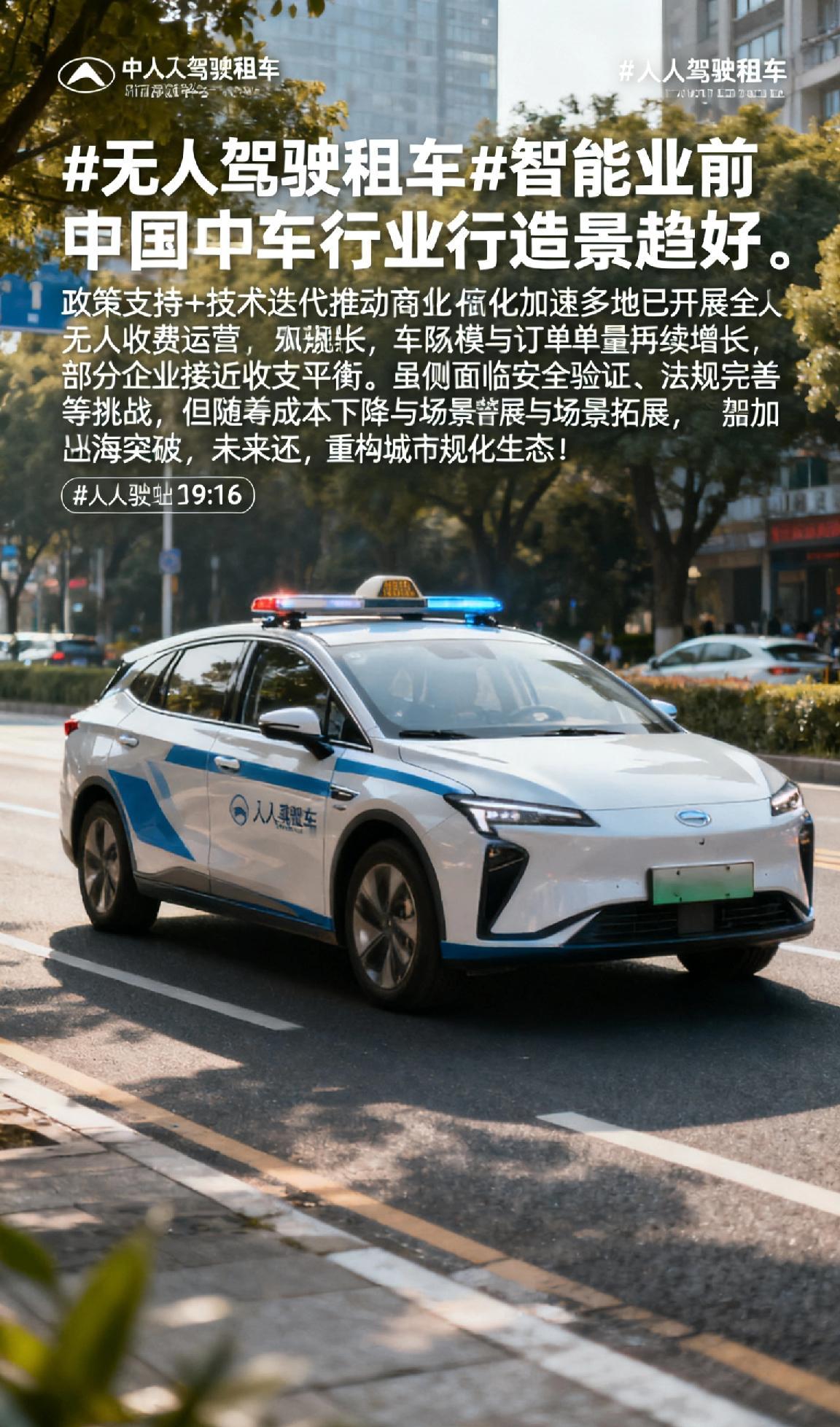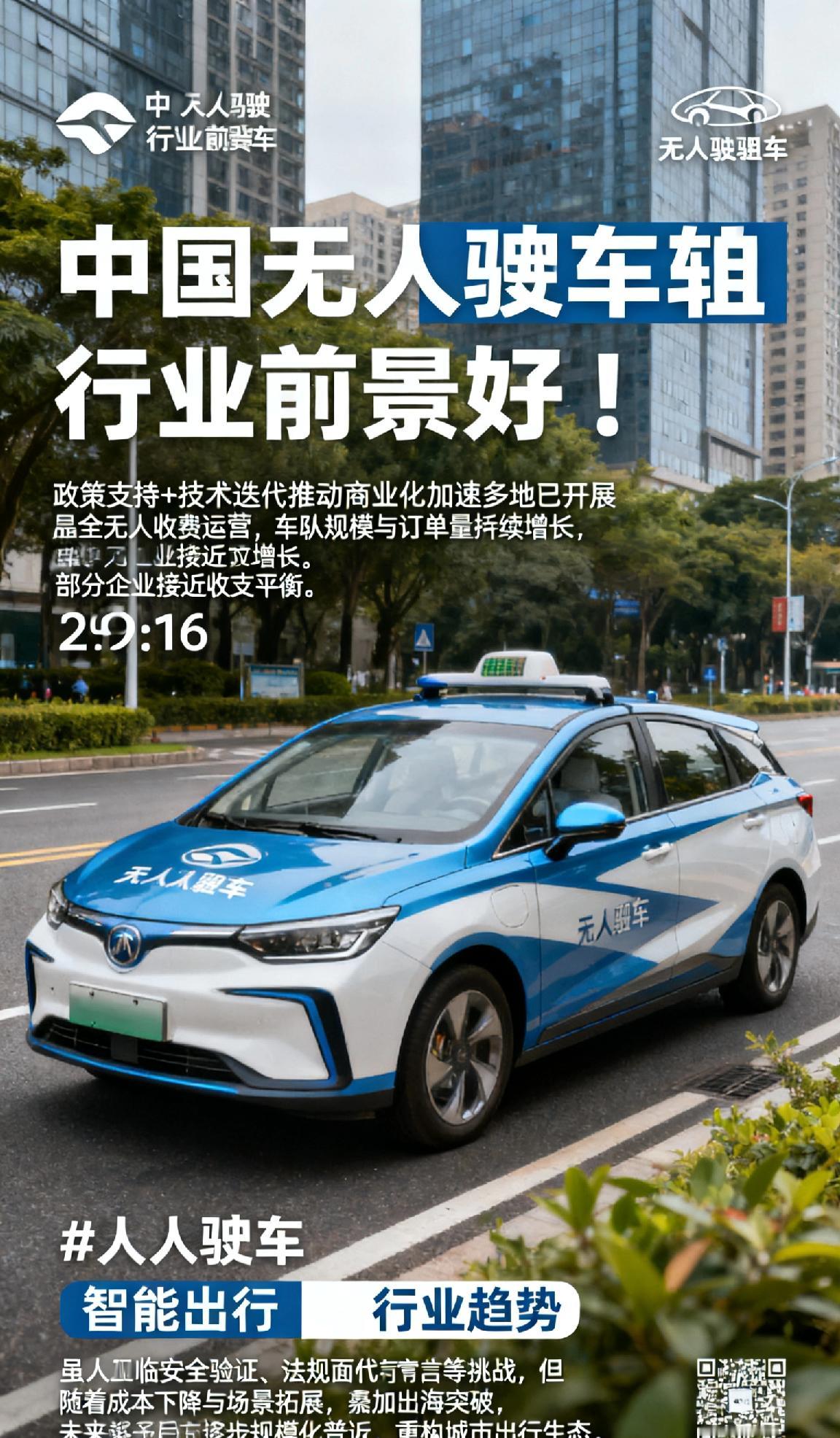 中国无人驾驶出租车行业的未来发展如何中国无人驾驶出租车行业前景向好!政策支持+技术迭代推动商业化加速,多地已开展全无人收费运营,车队规模与订单量持续增长,部分企业接近收支平衡。虽仍面临安全验证、法规完善等挑战,但随着成本下降与场景拓展,叠加出海突破,未来将逐步规模化普及,重构城市出行生态~ 无人驾驶出租车 智能出行
