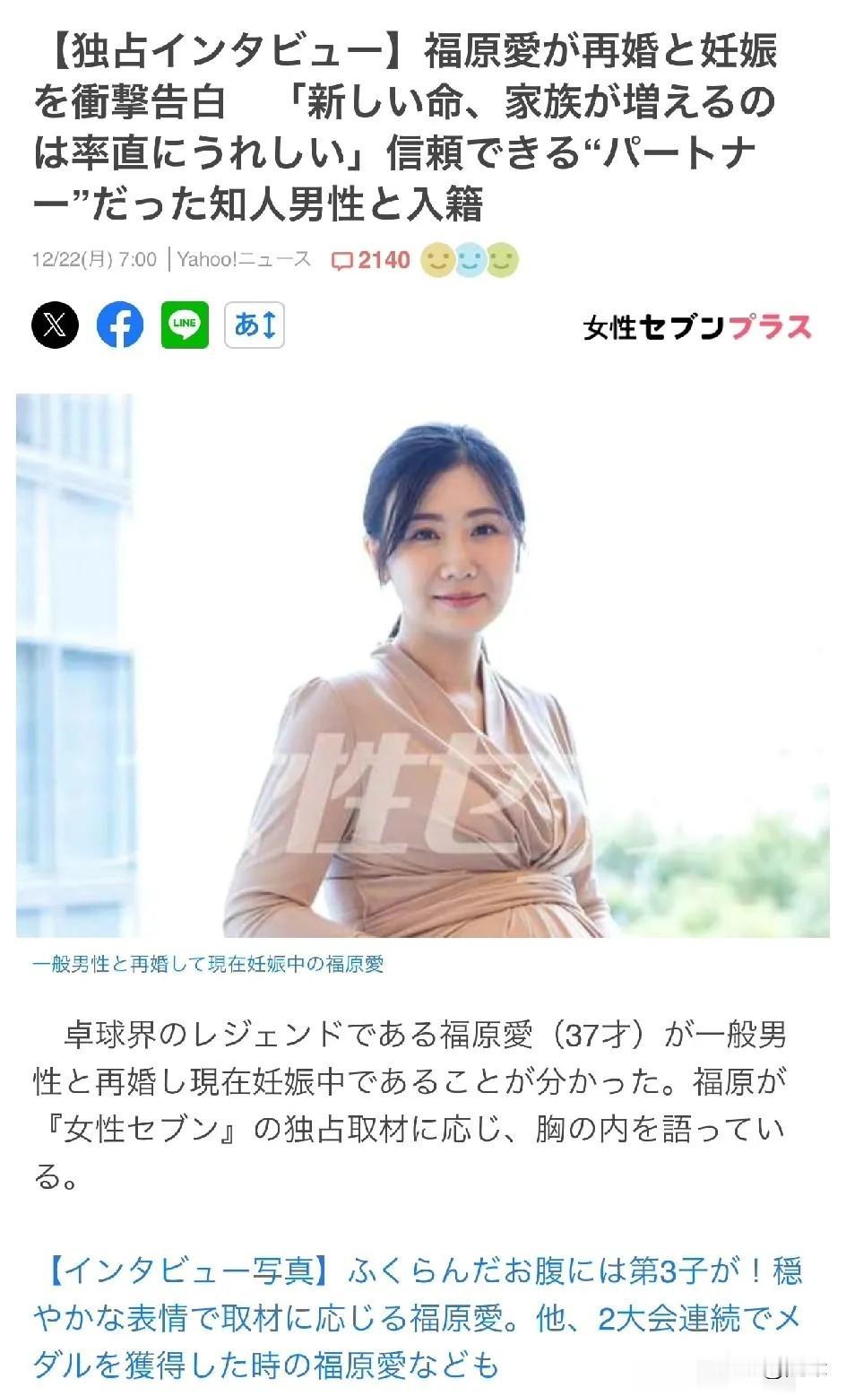 37岁福原爱官宣再婚且怀孕!孕肚照曝光,一脸幸福! 福原爱与前夫江宏杰育有一儿一