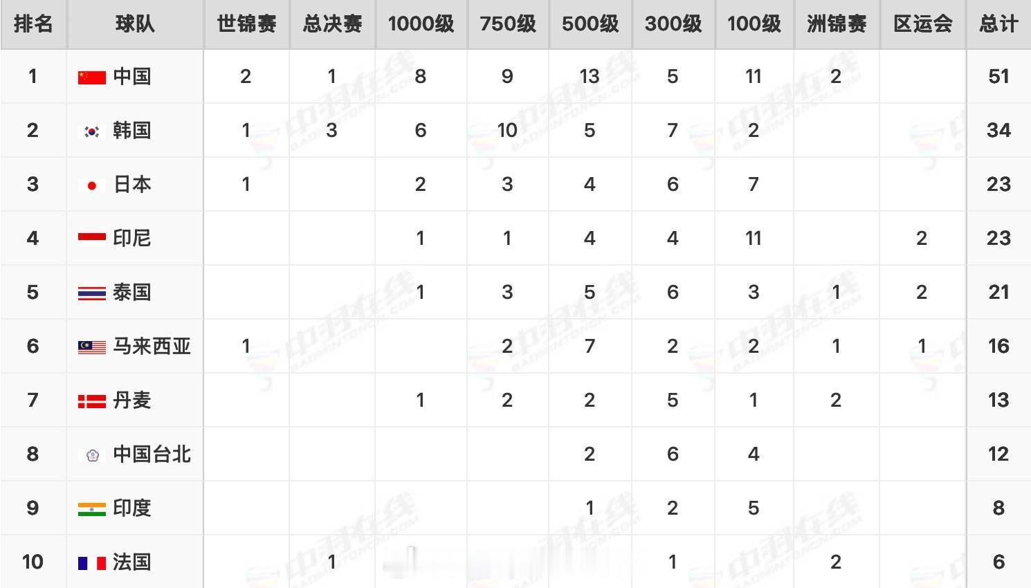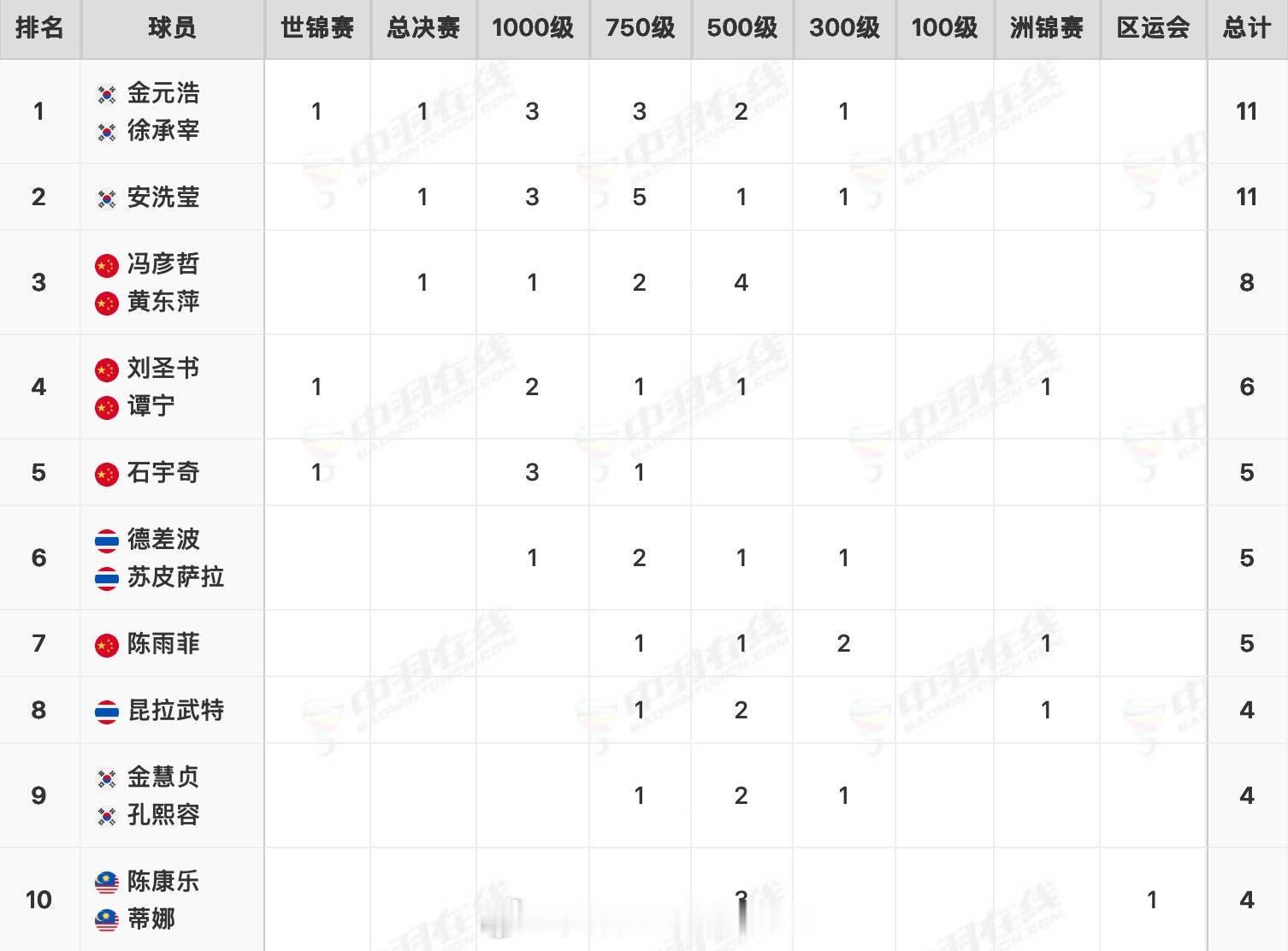 随着2025年世界羽联年终总决赛落幕,世界羽联巡回赛2025赛季全部比赛结束,冠军🏆统计榜单随即出炉, 在球队榜🇨🇳国羽以51枚金牌高居榜首,球员榜则由韩国🇰🇷的金元浩/徐承宰、安洗莹各夺得11枚金牌包揽前二,国羽凤凰组合排名第三!统计来源:中羽在线羽毛球