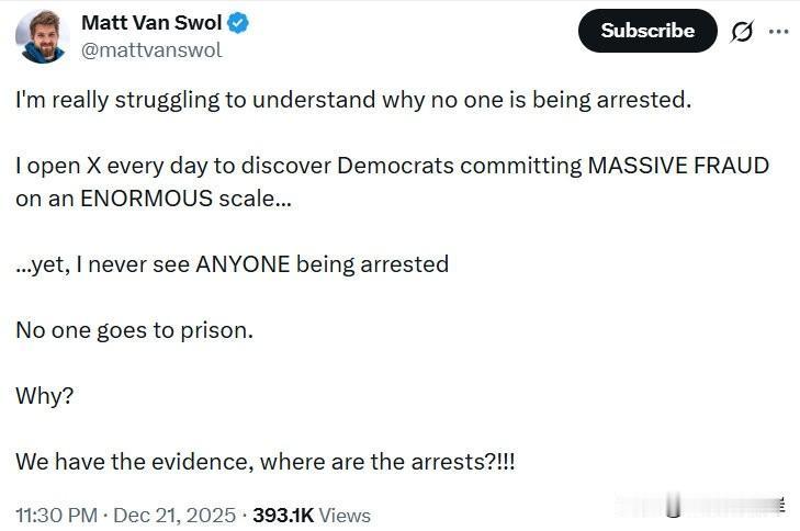 MattVanSwol: “我实在搞不懂为什么没人被抓。 我每天都在X上看到民主党人在大规模地实施巨额舞弊…… 可我却从没见任何人被逮捕, 没人进监狱。 为什么? 证据我们都掌握了,逮捕的人呢?!!!”