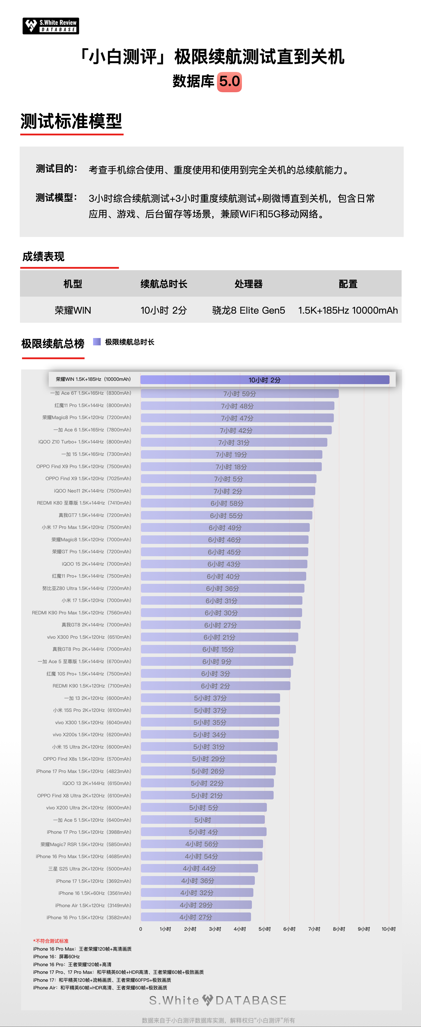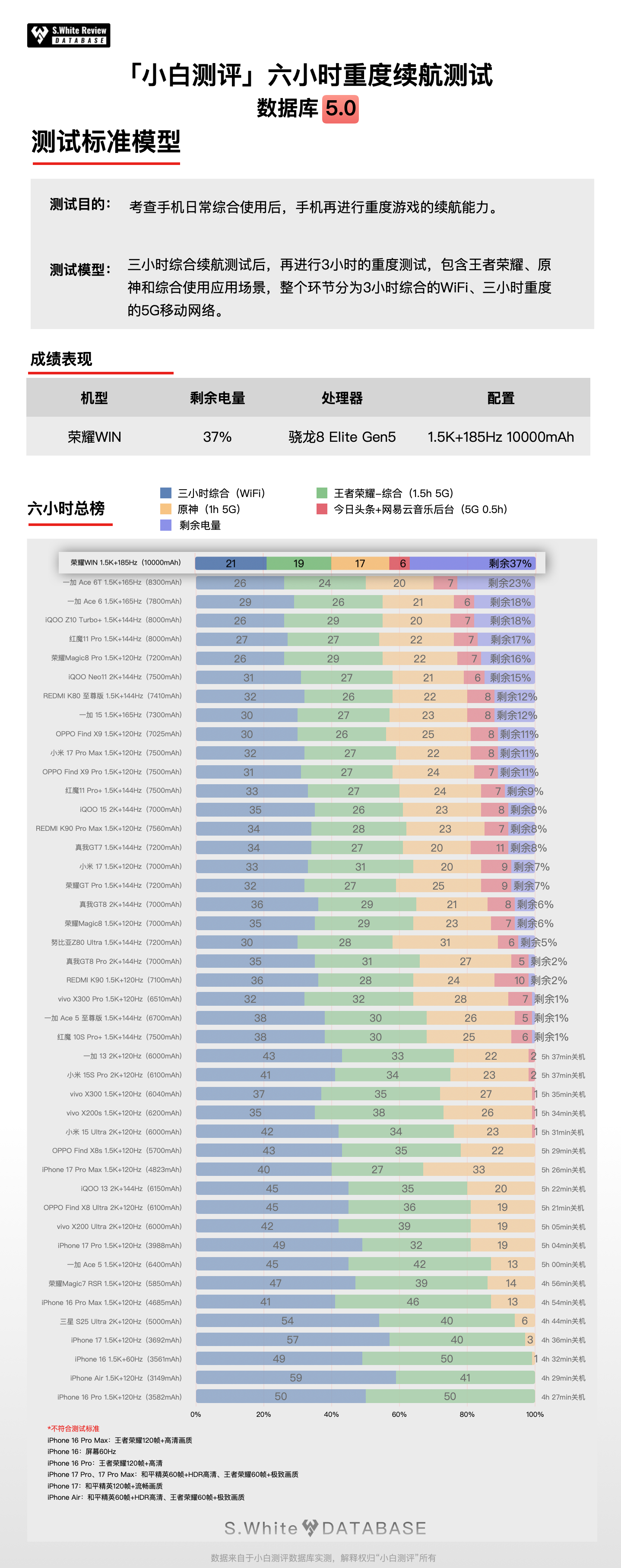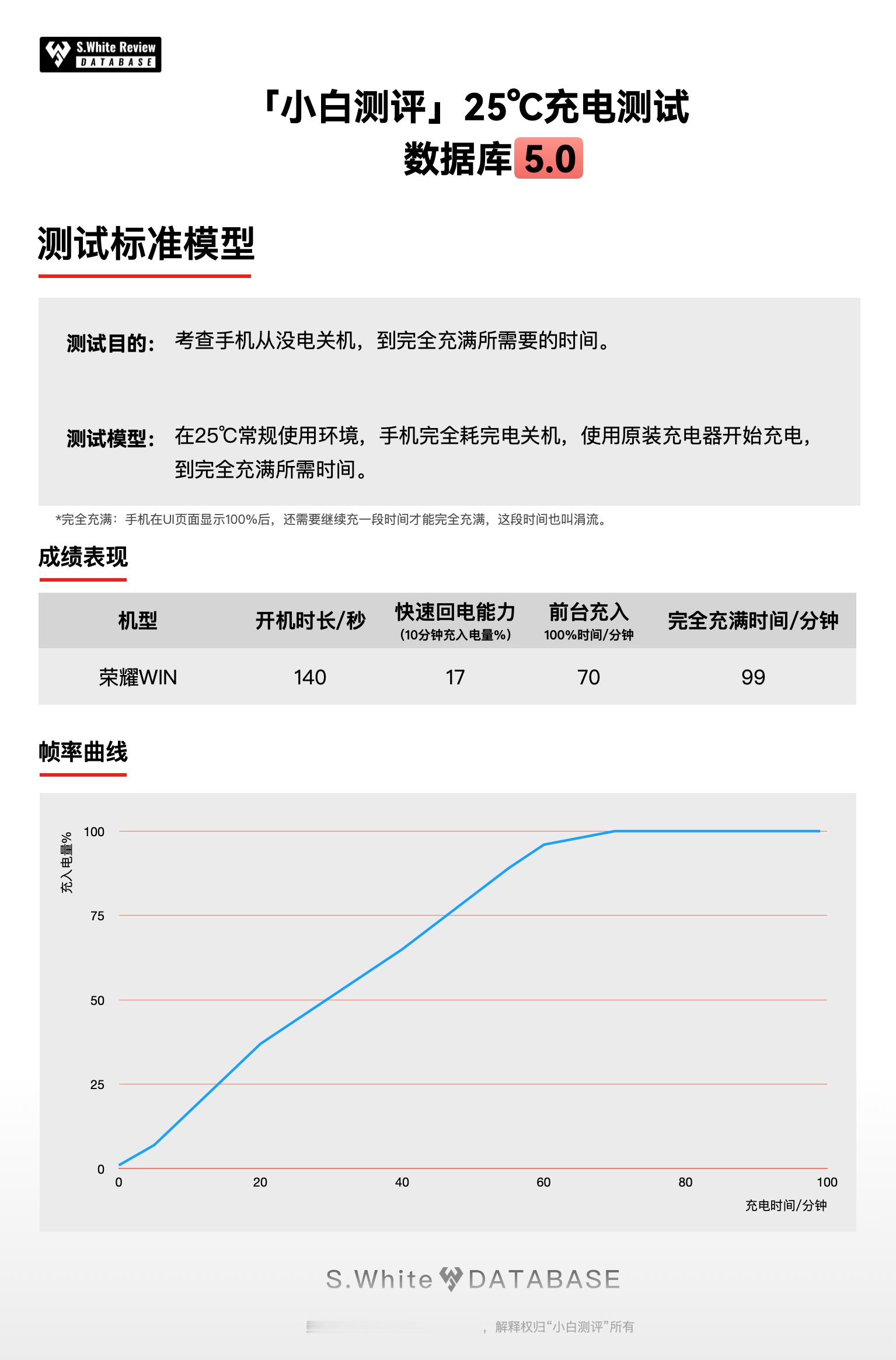 常规手机电池步入10000mAh!这曾经只是充电宝的容量,现在也是荣耀WIN系列的,非常好奇续航到底如何?荣耀WIN和荣耀WIN RT两台手机表现都非常抢眼,续航水平几乎持平。「数据库5.0-多场景续航模型」实测:「续航成绩」三小时综合续航测试剩余79%,六小时重度续航测试剩余37%,极限续航测试直到关机,共坚持了10小时2分钟。(在120Hz刷新率下测试)测试是全程亮屏,项目包含应用内、后台留存、应用启动和应用切换等日常使用场景,以及负载高的游戏场景,荣耀WIN的三个成绩都突出,大电池带来的续航收益挺明显。「充电成绩」25℃标准环境温100W原装充电器测试:10分钟快速回电17%,70分钟前台充入100%,99分钟完全充满。小白测评数据库5.0环境温25℃±0.5℃,屏幕亮度350nits,全新机械臂操作、高速相机进行数据采样