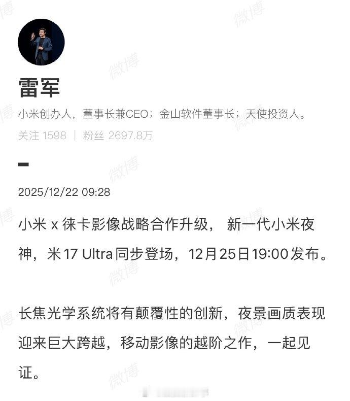 【雷军回应小米17Ultra定档】雷军称一起见证小米17Ultra12月22日,发文,称:小米 x 徕卡影像战略合作升级,定档12月25日19:00,新一代小米夜神,小米17 Ultra同步登场。12月22日,发文:长焦光学系统将有颠覆性的创新,夜景画质表现迎来巨大跨越,移动影像的越阶之作,一起见证。
