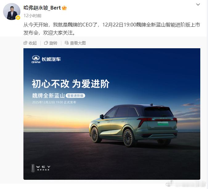 赵永坡接棒长城魏牌CEO12月21日,长城哈弗品牌总经理赵永坡宣布接任魏牌CEO,同时预告了12月22日19:00魏牌全新蓝山智能进阶版上市发布会。汽场全开赵永坡接任长城魏牌CEO蓝山VLA大模型上车首秀长城魏牌