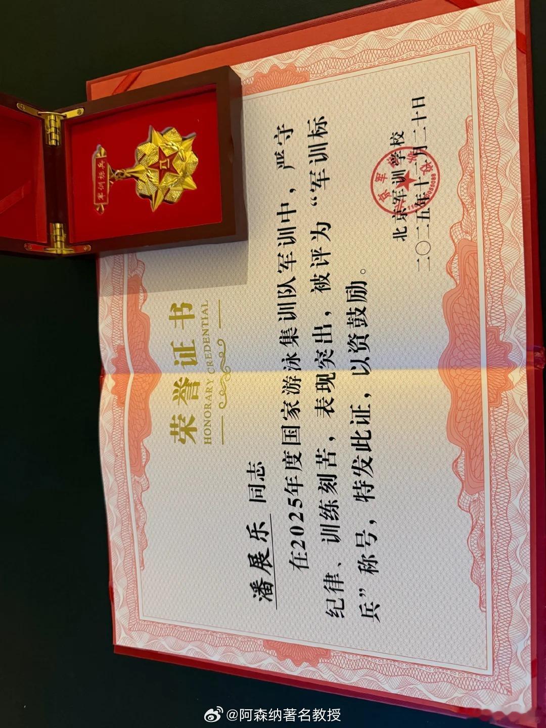 潘展乐晒军训标兵证书我乐真的太板正了!军训圆满结束,冬训加油!