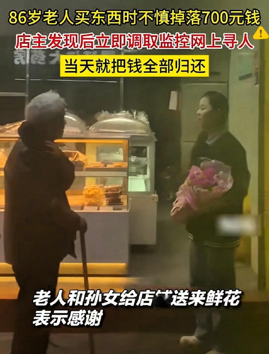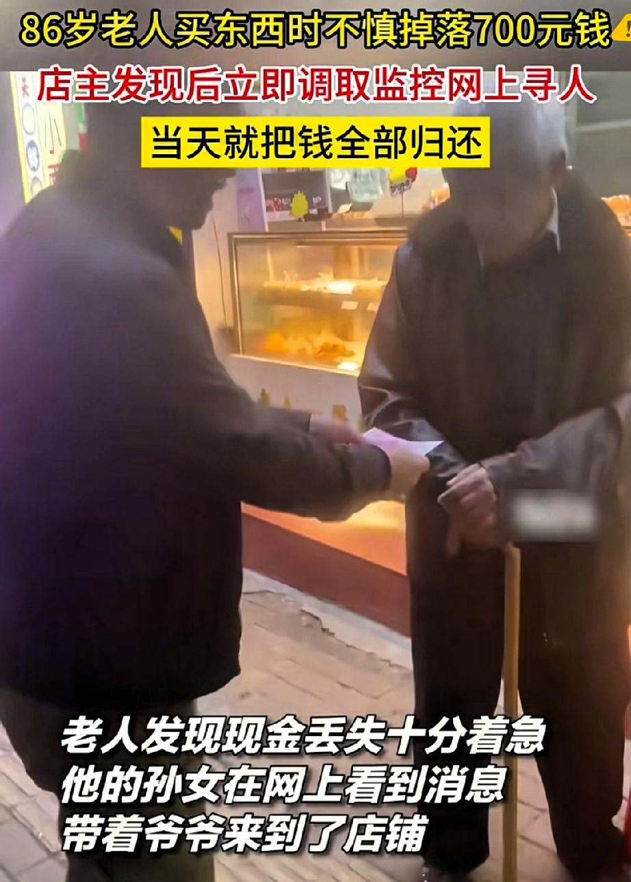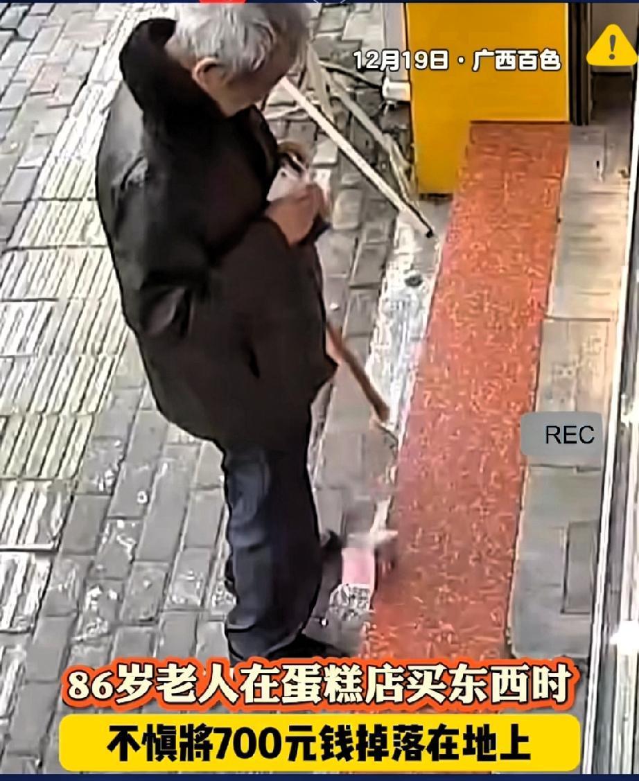 广西百色这一幕太暖哭! 86岁老人蛋糕店付款掉了700块救命钱浑然不觉,店主黄女士的做法,才是人间最难得的良心! 老人穿洗发白的中山装,手抖着掏半天钱,掉了700块买药钱转身就走,黄女士捡起钱追出去没影,立马关店按着监控方向,挨家挨户找了半个多小时,终于在小区石凳上找到急哭的老人,一分不少把钱还回去,还婉拒了感谢费。 700块对店主是几天营业额,对八旬老人却是救命钱,她守住的哪里是钱,是生意人最金贵的诚信,更是刻在骨子里的善良。 这年头不缺精明人,缺的就是这种不贪小利、主动担责的实在人,善良从不是口号,是伸手帮人的本能。 老人后来上门道谢,双向奔赴的善意太治愈! 你遇见过这样的暖心老板吗?评论区说说~