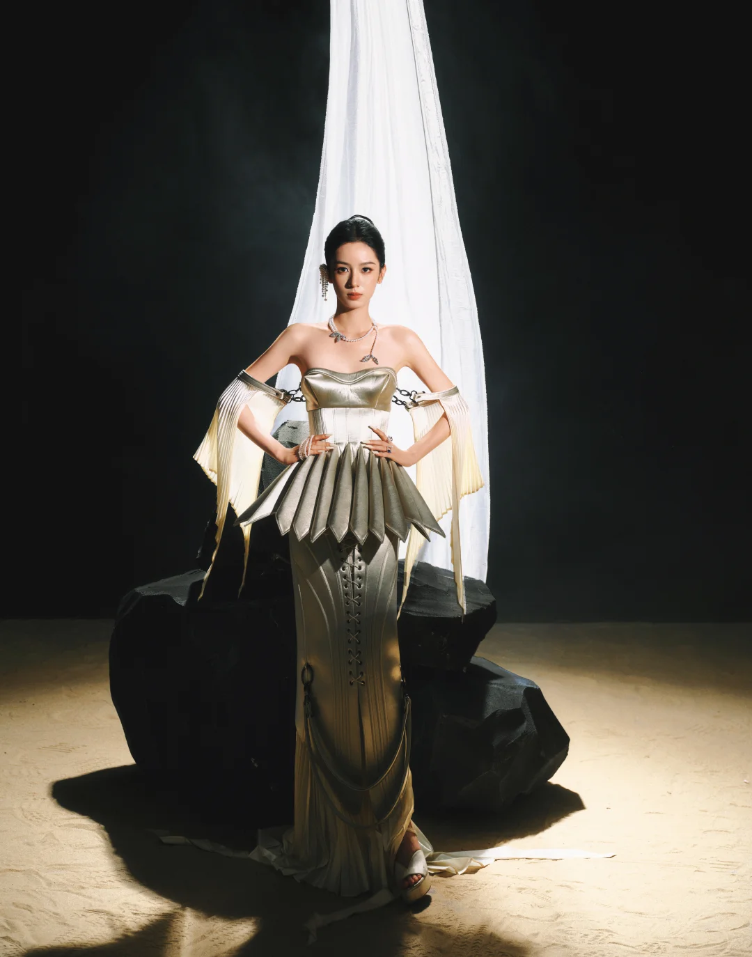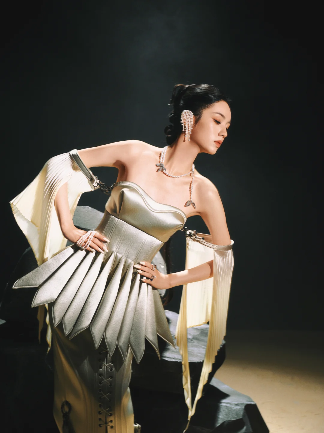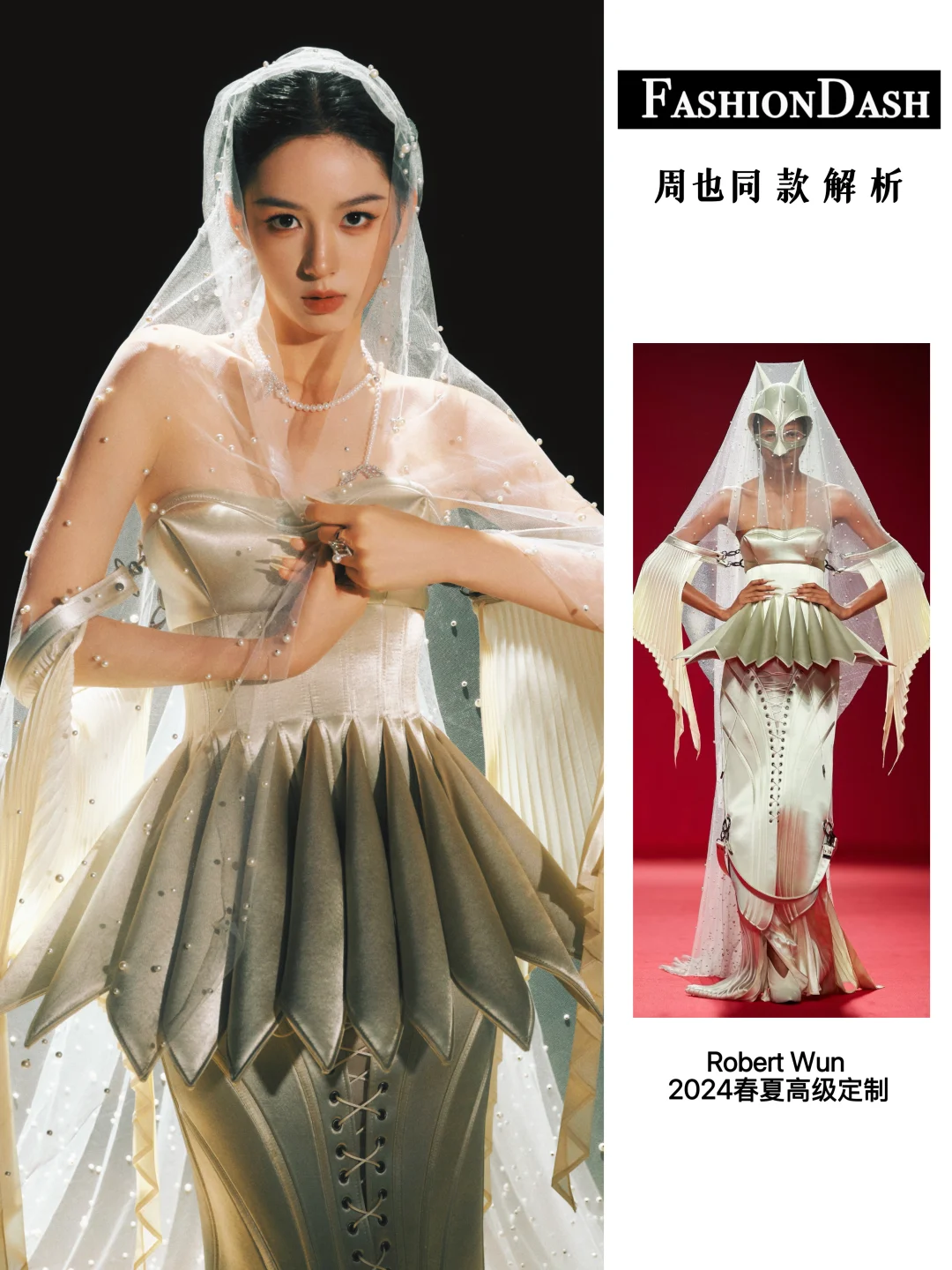 周也今日红毯造型,来自Robert Wun 2024春夏高级定制的系列,好特别的一套!