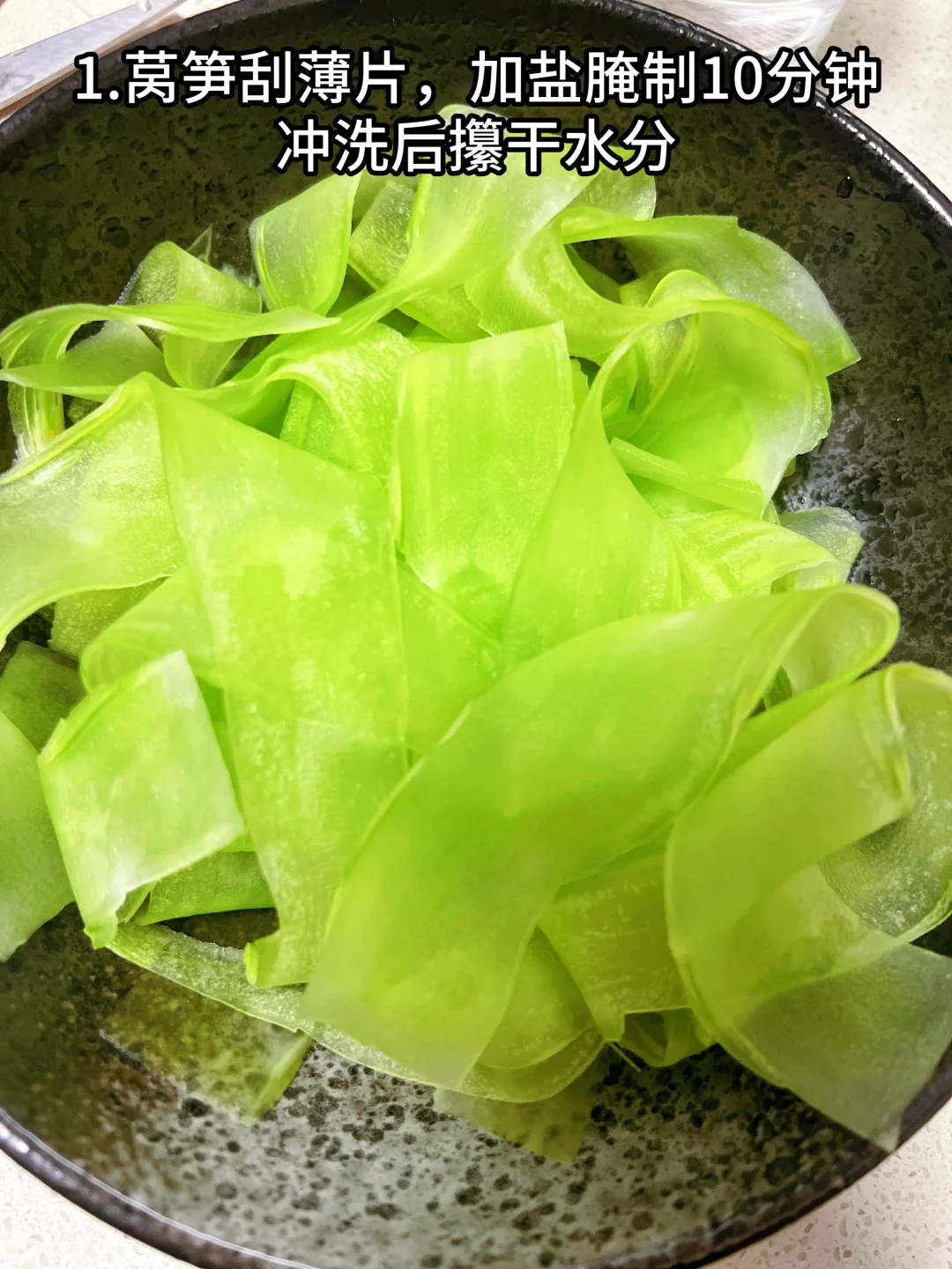 1、莴笋片一定要刮薄、攥干,这是保证脆嫩口感的核心;
