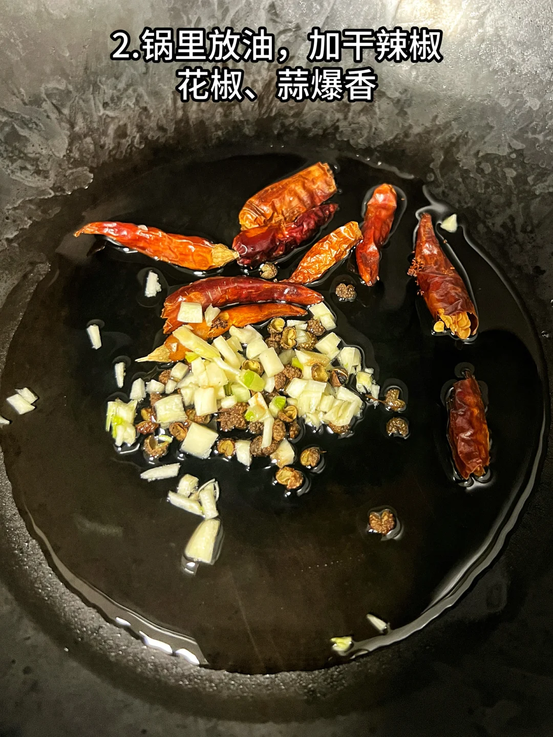 2、锅里放油,加干辣椒、花椒、蒜爆香