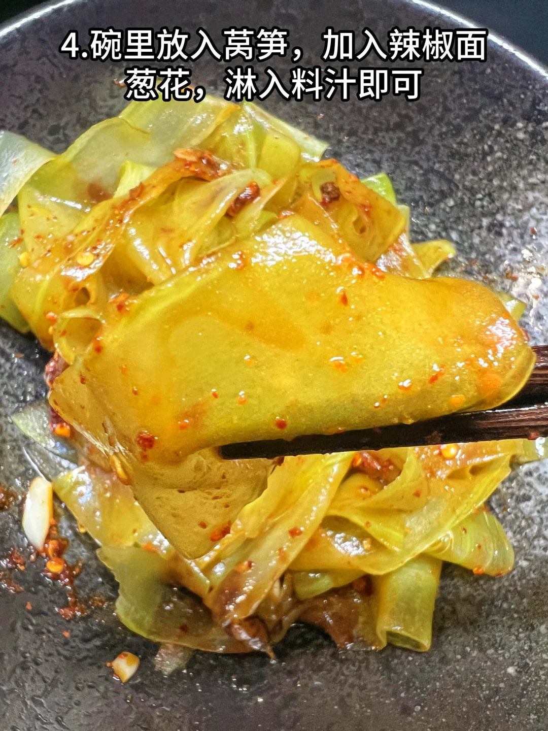 4、碗里放入莴笋,加入辣椒面、葱花,淋入料汁即可