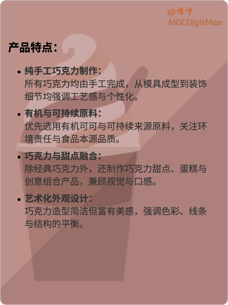 艺术化外观设计: 巧克力造型简洁但富有美感,强调色彩、线条与结构的平衡。