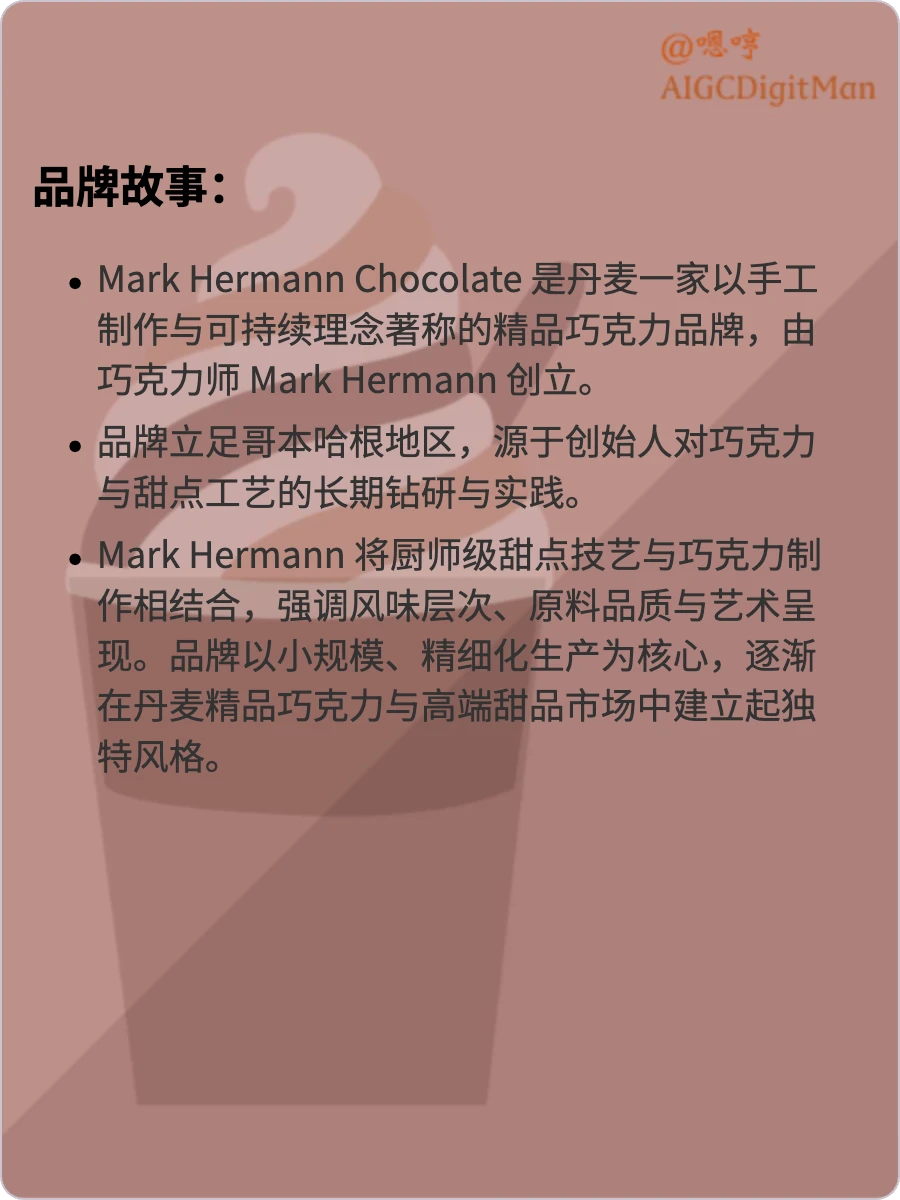 品牌立足哥本哈根地区,源于创始人对巧克力与甜点工艺的长期钻研与实践。Mark Hermann 将厨师级甜点技艺与巧克力制作相结合,强调风味层次、原料品质与艺术呈现。