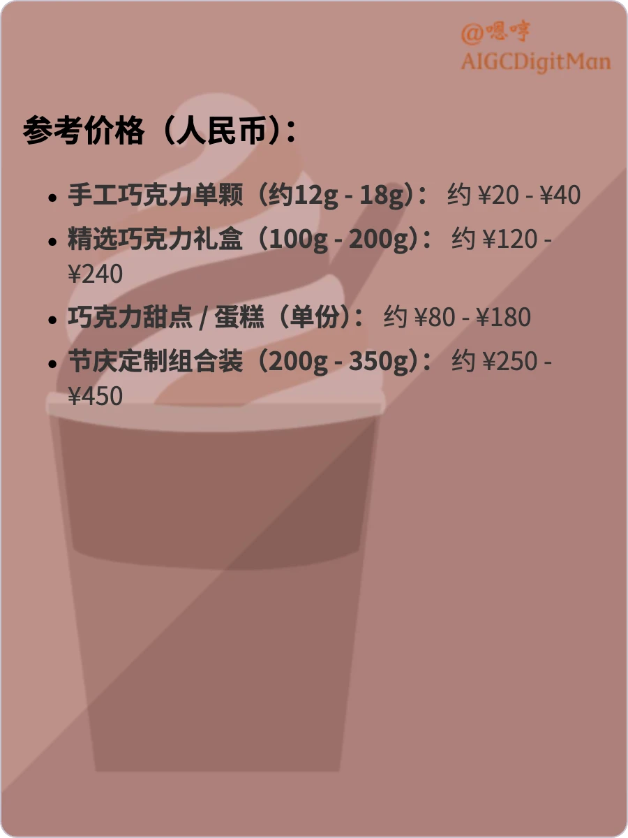 手工巧克力单颗(约12g - 18g): 约 ¥20 - ¥40