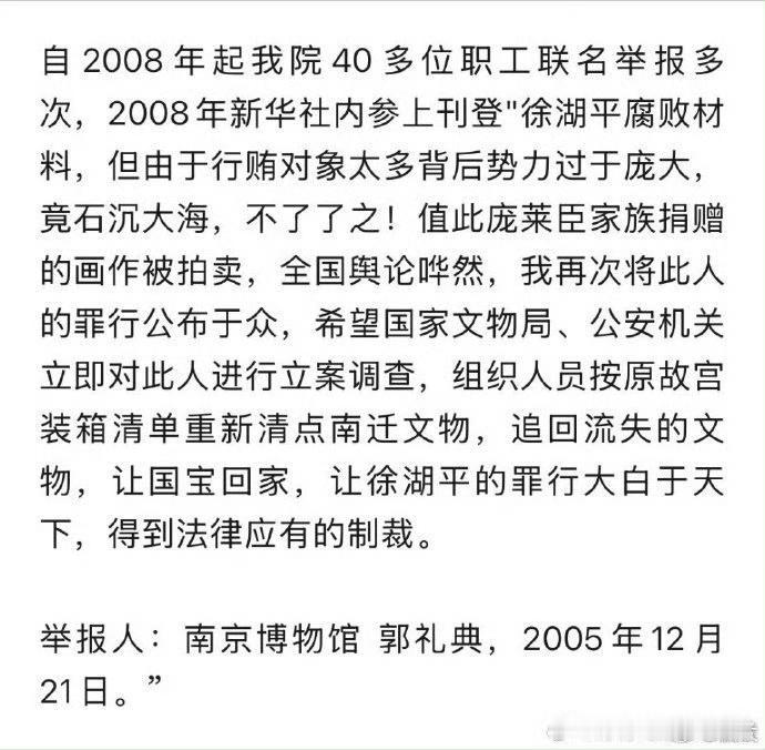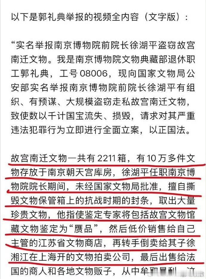 南京博物院四十多位老员工联名举报前院长徐湖平,都是院里的资深干部和高级知识分子,看来不是随便说说的! 他们说故宫南迁来的文物有2211箱、十万多件,都存放在朝天宫库房,徐湖平当院长时,没经过国家文物局批准,就撕了抗战时期的封条,把大量珍贵文物取出来。还指使专家把这些文物鉴定成赝品,低价卖给省文物商店,再通过他儿子在上海的拍卖公司,倒卖给法国商人跟文物贩子,赚了不少黑心钱,里面还有官窑瓷器和国宝级书画。 更离谱的是,有幅捐赠的古画,当年被低价转卖,如今现身拍卖会估值八千多万。现在文旅厅已经成立专班调查,希望能尽快查清真相,把流失的文物追回来!