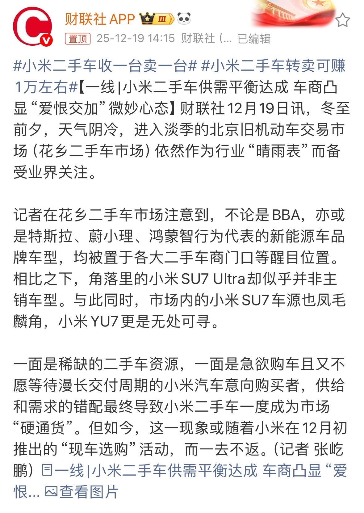 说实话,我也是头一次见这么保值得车,作为SU7和YU7双车主,刚买的时候我就知道小米汽车很受欢迎。但是也没想到后续还会一直这么火,还这么保值。所以,这也算是给了网友们一个买车的小tips,销量指定是要看的,这代表着一辆车的市场保有量;再者,二手市场也可以作为参考,之前我们可能觉得二手市场什么车多,感觉这个牌子会很牛。但其实恰恰相反,反而在二手市场作为凤毛麟角存在的车,往往更能代表它的价值。当然,这还要把销量这个标准加进去。小米二手车转卖可赚1万左右小米二手车收一台卖一台