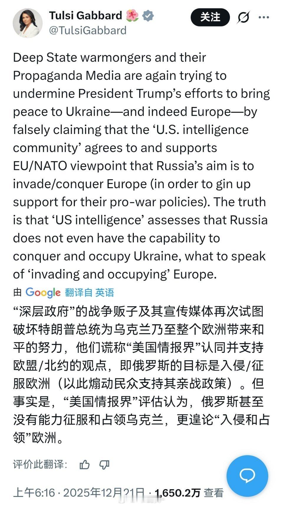 美国国家情报总监,图尔西·加巴德认为俄罗斯无力占领整个乌克兰,更没能力入侵整个欧洲,制造叙事的是“深层政府”“深层政府”的战争贩子及其宣传媒体再次试图破坏传普总统为乌克兰乃至整个欧洲带来和平的努力,他们谎称“美国情报界”认同并支持欧盟/北约的观点,即俄罗斯的目标是入侵/征服欧洲(以此煽动民众支持其亲战政策)。但事实是,“美国情报界”评估认为,俄罗斯甚至没有能力征服和占领乌克兰,更遑论“入侵和占领”欧洲。海外新鲜事
