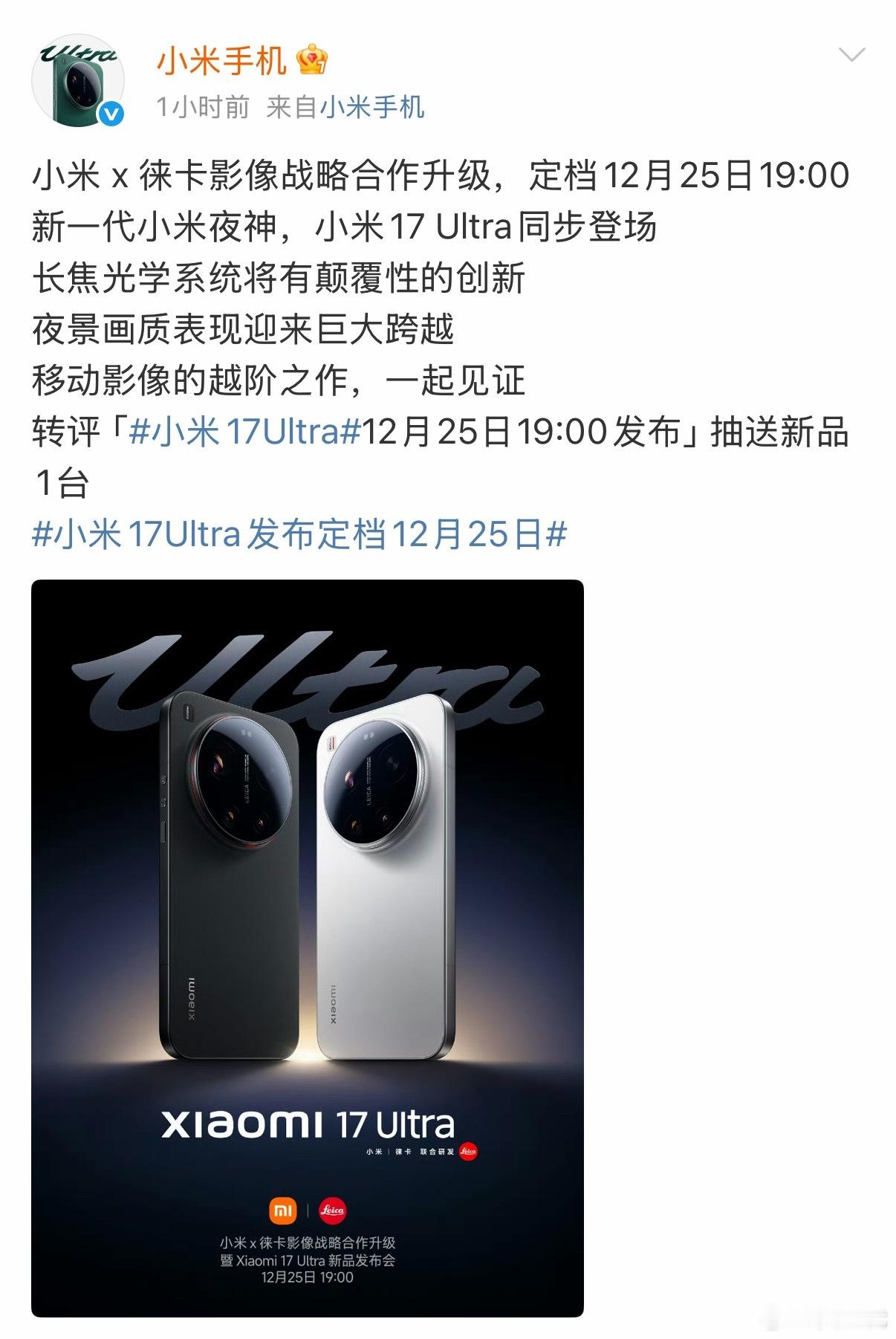 小米17Ultra发布定档12月25日小米17 Ultra明显又提档了,往年都要到年后发布的,再也不是半年机皇。行业独家的1英寸主摄+2亿连续光变长焦,完全有实力和26年的所有Ultra碰一碰。海报图上的17 Ultra后盖并没有徕卡小红标,如果真如网上所说还有一个带小红标的大师版/特别版,那必须得充首发好吧