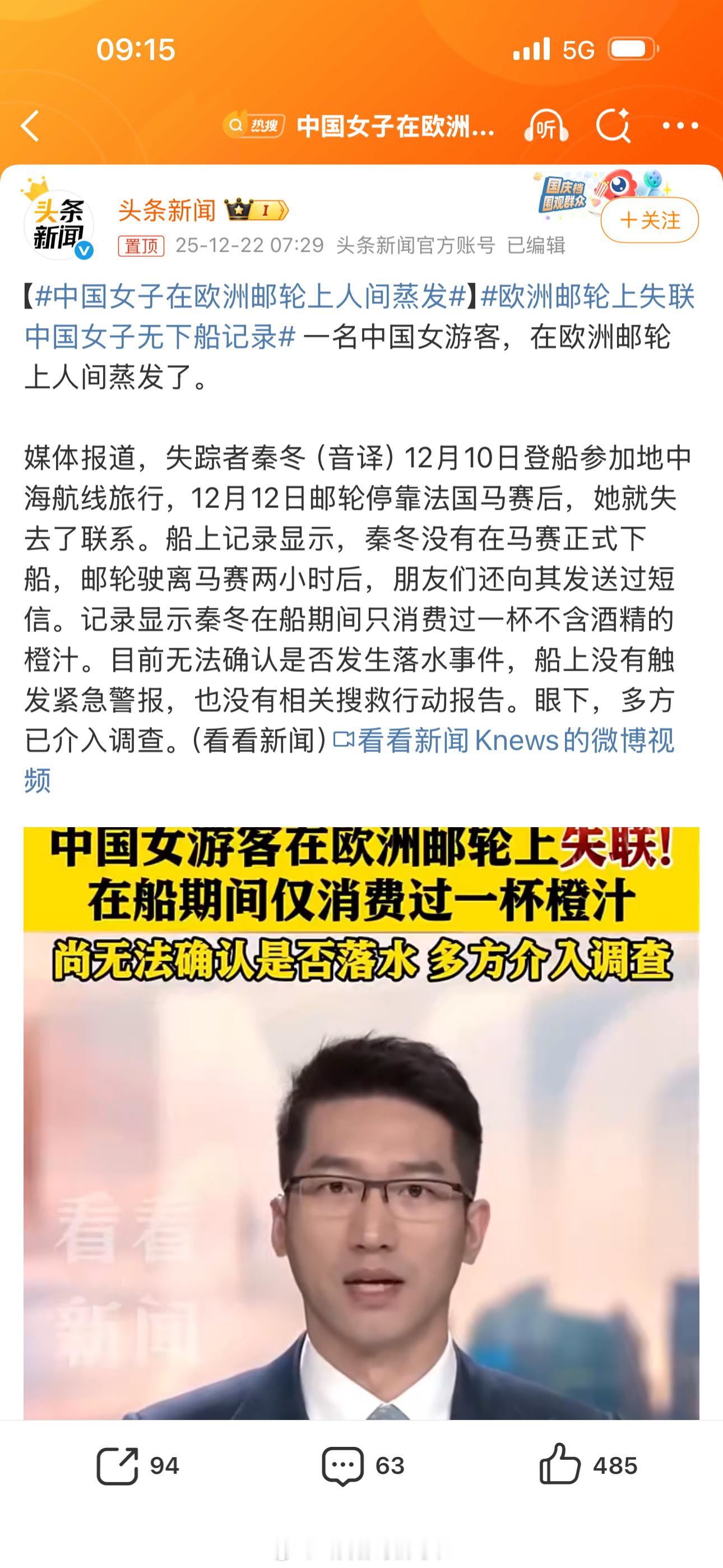 中国女子在欧洲邮轮上人间蒸发吓人!不会是自己站甲板自拍时不小心落水了没人看见?