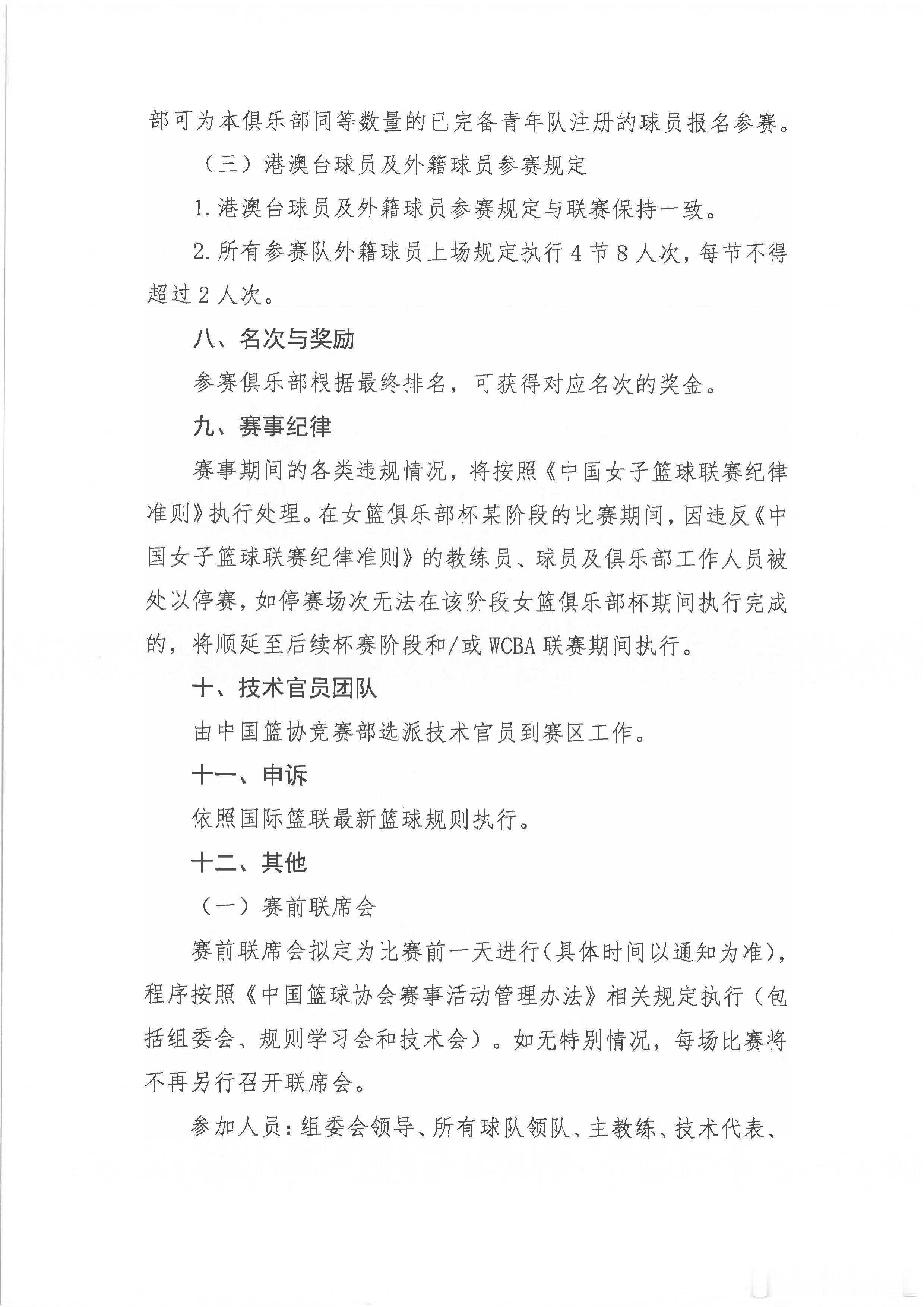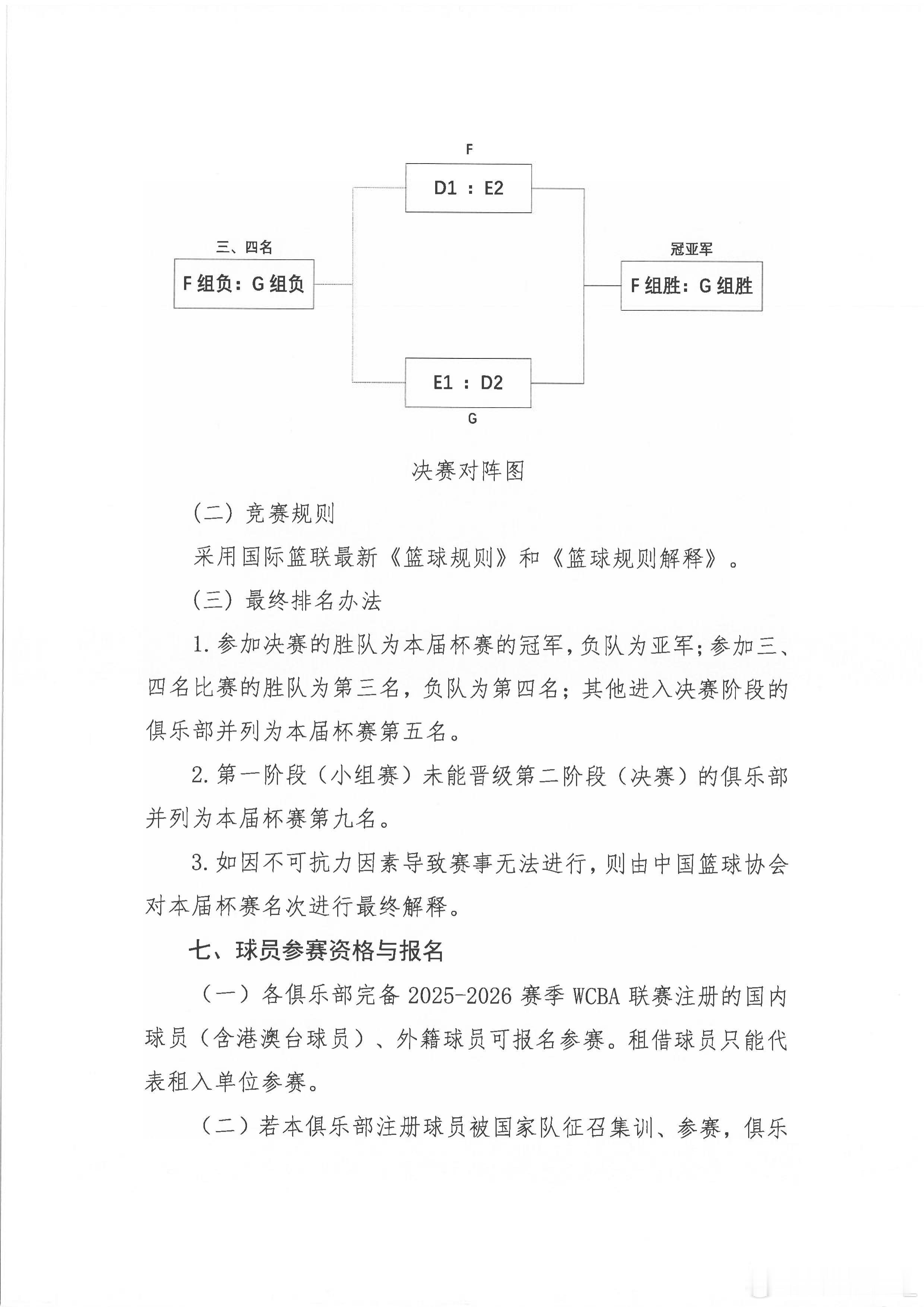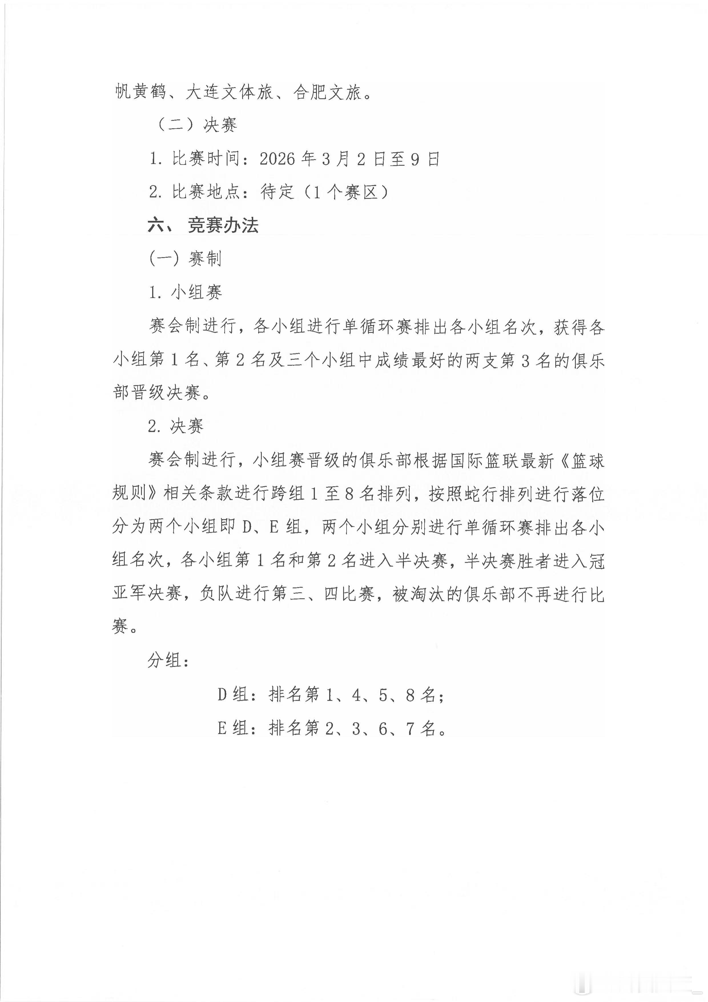 【首届WCBA俱乐部杯竞赛规程发布】日前,中国篮协正式印发2026年中国篮协女子篮球俱乐部杯的竞赛规程,除具体赛区待定外,其他核心信息均已披露,主要包括以下几个方面: [时间] 小组赛阶段(3个赛区):2月6日-12日 决赛阶段(1个赛区):3月2日-9日 [分组] 根据上赛季联赛成绩蛇形排列,分为A、B、C三个小组,每组6支球队,这与季前赛时的分组情况极为类似。 A组:广东、江苏、新疆、浙江、福建、江西 B组:四川、山东、北京、陕西、河南、厦门 C组:山西、上海、河北、武汉、大连、合肥 [赛制] 小组赛阶段,各小组进行单循环,各小组前两名和成绩最好的两个第三名,共八支球队晋级决赛阶段。决赛阶段,八支球队蛇形排列分为两组,组内进行单循环,前两名晋级,交叉进行半决赛,半决赛胜者角逐冠军。 [排名办法] 参加决赛的胜队为本届杯赛的冠军,负队为亚军;参加三、四名比赛的胜队为第三名,负队为第四名;其他进入决赛阶段的俱乐部并列为本届杯赛第五名。参加小组赛阶段但未能晋级决赛阶段的俱乐部并列为本届杯赛第九名。 [参赛资格] 各俱乐部完备2025-2026赛季WCBA联赛注册的国内球员(含港澳台球员)、外籍球员可报名参赛。若本俱乐部注册球员被国家队征召集训、参赛,俱乐部可为本俱乐部同等数量的已完备青年队注册的球员报名参赛。所有参赛队外籍球员上场规定执行4节8人次,每节不得超过2人次。