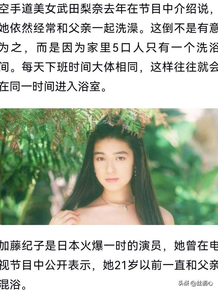在日本,女儿出嫁前与父亲共浴,是一种风俗习惯,是女儿对父亲的一种报答和感激。 日本空手道美女武田梨奈就曾公开的承认,经常与父亲一起洗澡,主要原因就是家里就一个浴池[捂脸],日本女星彩芽也承认,经常和父亲一起泡澡,家人关系好的不得了。 这样的习惯你接受得了吗?