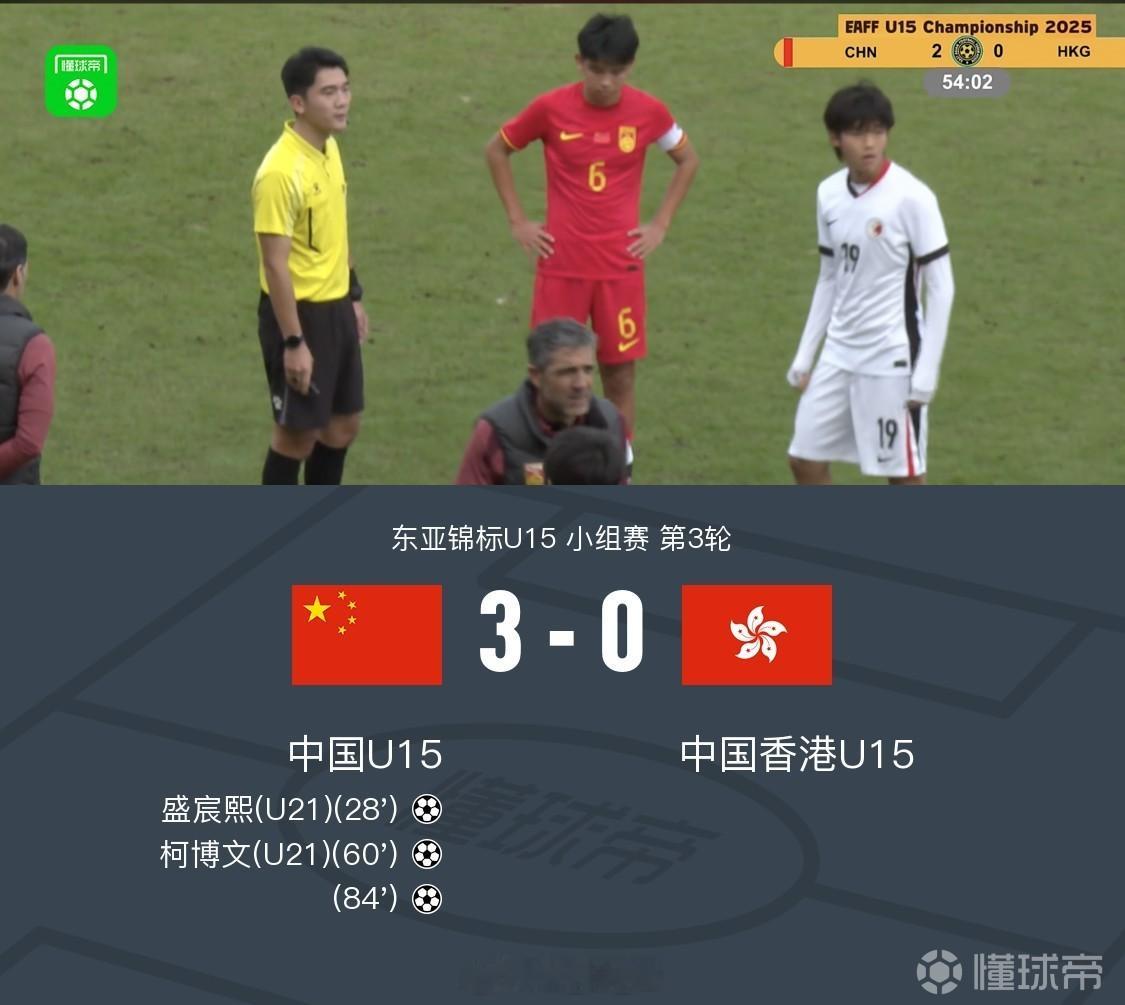 北京时间12月22日东亚锦标U15小组赛第3轮,中国U15 3-0 中国香港U15。