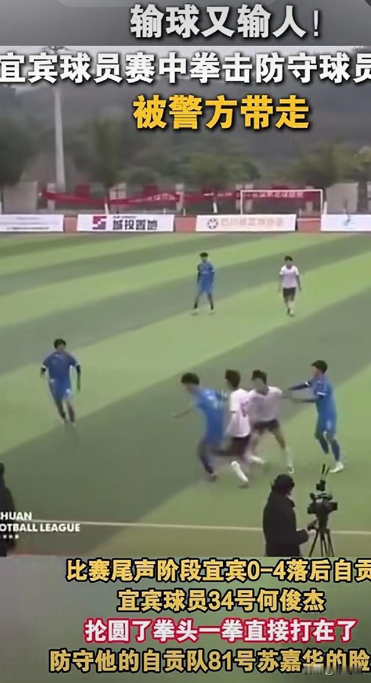 “打球没火,打人火了”。近日四川三大球城市联赛上,宜宾队对阵自贡队的比赛火了,不是因为0-4的精彩进球,而是赛场打人的闹剧,网友们抛开地域偏见,清一色吐槽“太掉价”。 这场球的走向其实很明确,白衣球服的自贡队全程占优。当时宜宾队34号球员和自贡队81号球员正在拼抢一个球,谁也没想到过程中,因为不满后面的球员顶住了自己,宜宾队那名球员突然转身,二话不说就是一拳,狠狠砸在自贡队球员的脸上。被打的球员当场就疼得倒在地上,后来直接被救护车拉去医院做伤情鉴定了。 球员动手已经够离谱,可宜宾啦啦队的操作更让人大跌眼镜。看到自家队员打人引发冲突,他们不仅没意识到问题,反而直接和现场自贡围观市民吵了起来。等到警方带走打人者时,这群啦啦队更是集体围上来怒喊“你们要咋子”,那架势仿佛受了多大委屈。 网友们看了都忍不住吐槽:“这是装糊涂还是真没常识?打人本来就是犯法的啊!”一句“你们要咋子”就能蒙混过去吗?这场冲突还引发了近30人混战,原本的绿茵场变成推搡争执的“格斗场”。 网友们的评论很实在:“输球不可怕,输人最丢人”,这哪还有什么体育精神,球员失控动手已经错了,啦啦队还要撒泼护短,更是把“体面”丢得一干二净。 (图片来自网络视频)