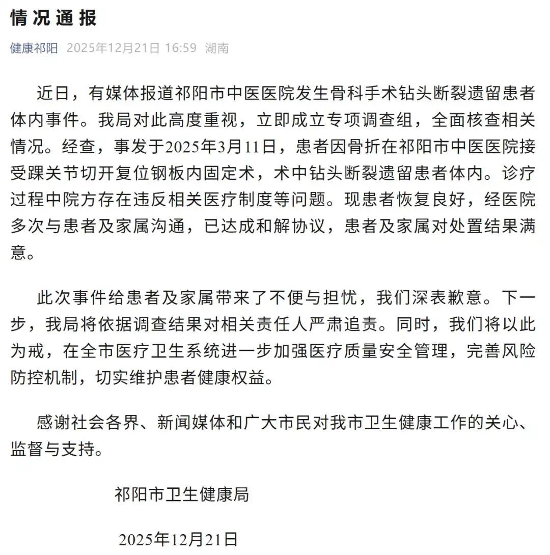 湖南一男子做骨科手术,手术后右腿一直疼,5个月后才知道,医生把钻头打断了,正掉在他的骨缝里面。而且没告知家属。而且,和他同病房同天做手术的病友,体内也留下了钻头…… 这年头,真是啥事都有。 话说在湖南祁阳,有一位周先生。 今年3月,周先生因为意外不慎跌倒,摔断了腿,被送到了祁阳市中医医院。 3月11日,医生给他做了手术。 结果出院之后,周先生觉得自己的右腿一直疼。去找主治医生询问,说没事,都这样。 在医院做检查,结果也是“没事”,“你体质差,恢复的慢。” 5个月后,周先生的右腿还是疼痛难忍,怀疑这家医院水平可能有问题。于是去了另外一家医院检查,然后就被告知:“你的体内好像有一个钻头。” “啊?” 周先生万万没想到,让自己疼了5个月的东西竟然是这么个玩意。 自己体内多了个钻头,那肯定是手术的时候弄进去的。 周先生去找中医院理论,主治医生这才承认手术的时候出了意外,“钻头不小心断了”。也没有通知家属。 而且,他还不是唯一一个遇到这种问题的。和周先生同病房,同天接受手术的柏先生也是手术后腿一直疼,后来去外院检查,发现里面有个断了的手术钻头。 这很明显属于事故了,医院为什么隐瞒呢? 医院给出的解释是“对患者影响不大,准备在后续取钢板时一并处理。” 很明显,这是违法的。 将钻头落在患者体内属于严重的操作失误,按照规定必须向患者或家属说明情况,这侵犯了患者的知情同意权。 更别说之后还刻意隐瞒。 医院说“影响不大”,但这剥夺了患者对自身健康状况的决策权,要不要立即取出,何时取出,应该由患者自己决定,而不是医院决定。 这事闹大之后,当地卫健局也接入进行了调解,但因为双方意见分歧太大, 最终决定闹上法庭。 卫健局表示,“将依据调查结果对相关责任人严肃追责。” 一天连续两次出现同一情况,还这么轻描淡写的决定“以后取出来”,恐怕也不是一次两次了。