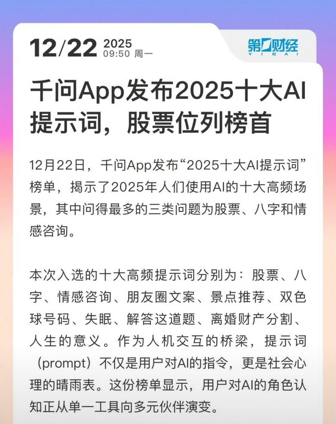 这和以前社媒平台,以及浏览器的年度十大词是一样的,反映的是过去一年,中国网民热议或关心的内容是啥。而AI给出的2025十大AI提示词,也非常真实,例如股票、八字、情感咨询,都是当下热议话题。随着AI产品的普及,AI平台发布的年度词可能要更加要真实。千问App发布2025十大AI提示词 股票双色球入选2025AI十大提示词