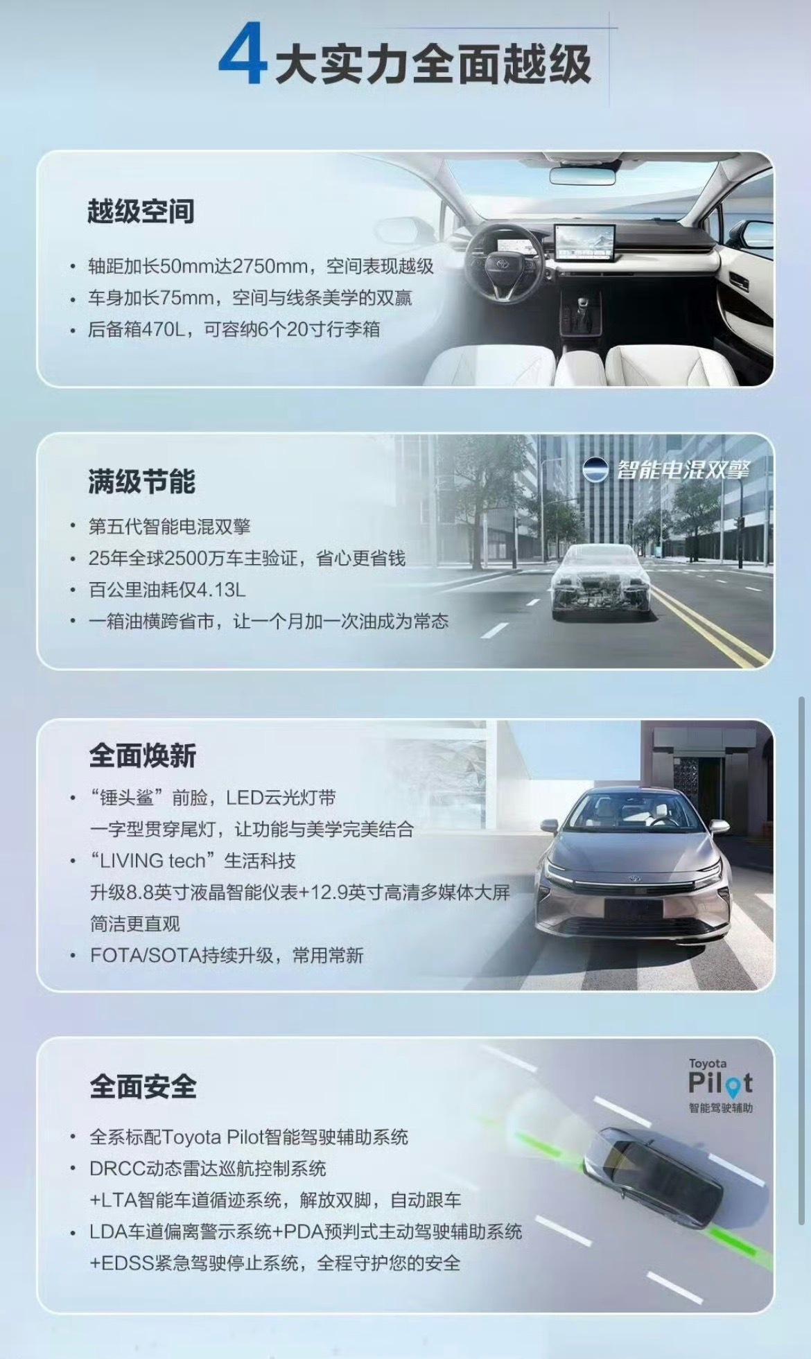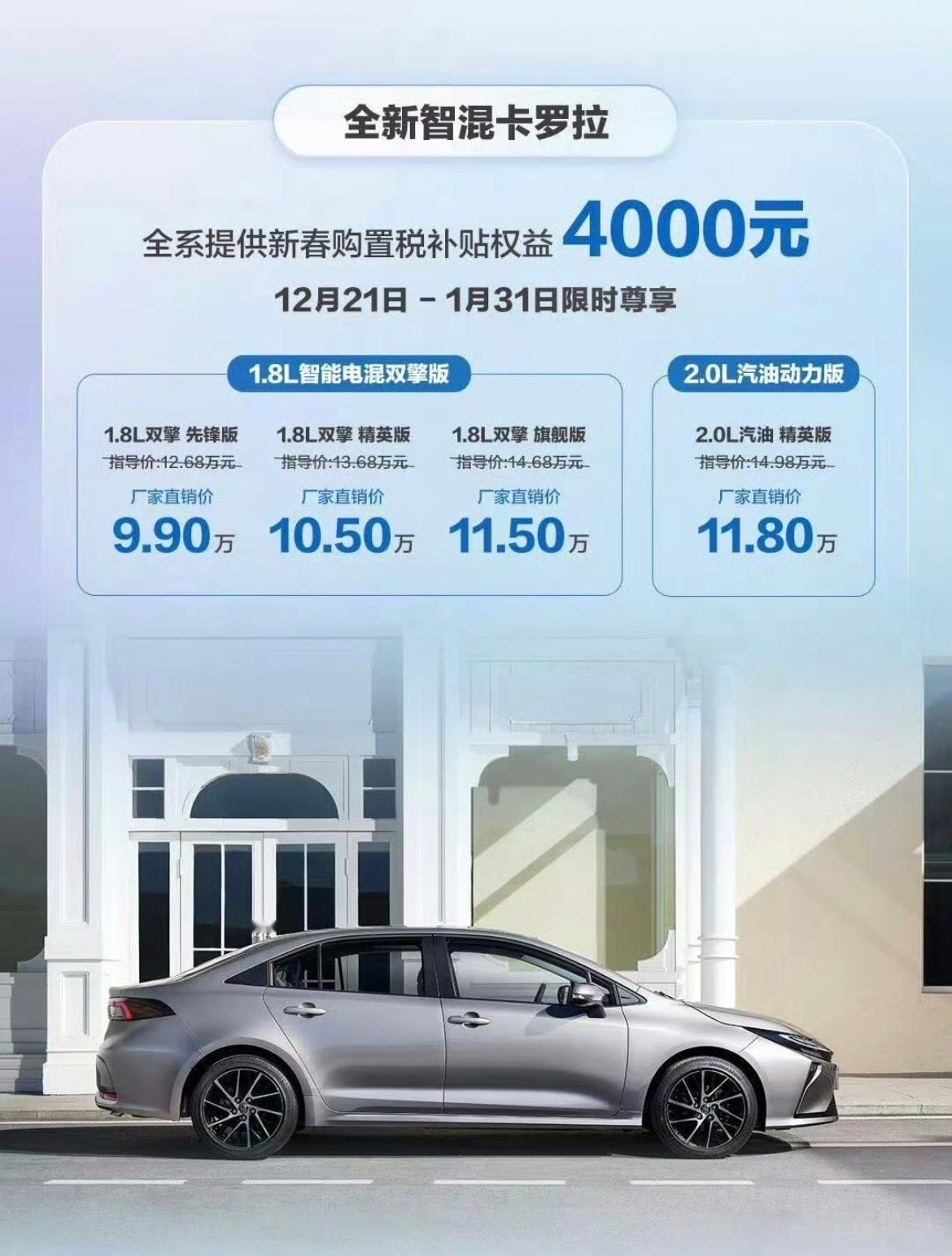 卡罗拉 9.9万起售的长轴距版卡罗拉偷摸的上市了,没有发布会也没有任何预热。 这次发售有三个1.8L双擎版本和一个2.0L汽油版本,混动版本采用比亚迪的电池。这次卡罗拉的轴距是2750mm,这和亚洲狮的轴距一模一样。这俩的定位有些重合了,估计未来对这两台车会有一个新的规划。悬挂采用前麦弗逊后双横臂,前脸用的是锤头鲨的造型,也算是改头换面了,算是小号凯美瑞。 这四个配置中,1.8L的精英版个人感觉性价比最高,车机上了8155芯片,内饰氛围灯,主驾电动座椅等等。最后这个2.0L的汽油精英版,算了一下全款落地下来不如加一点钱上凯美瑞。回到新车发布的时间,这已经是年底了,优惠补贴等基本都已经没了,其他减免政策估计也要等到春节过后才会公布,想要买车不如再等等吧。阿远说车