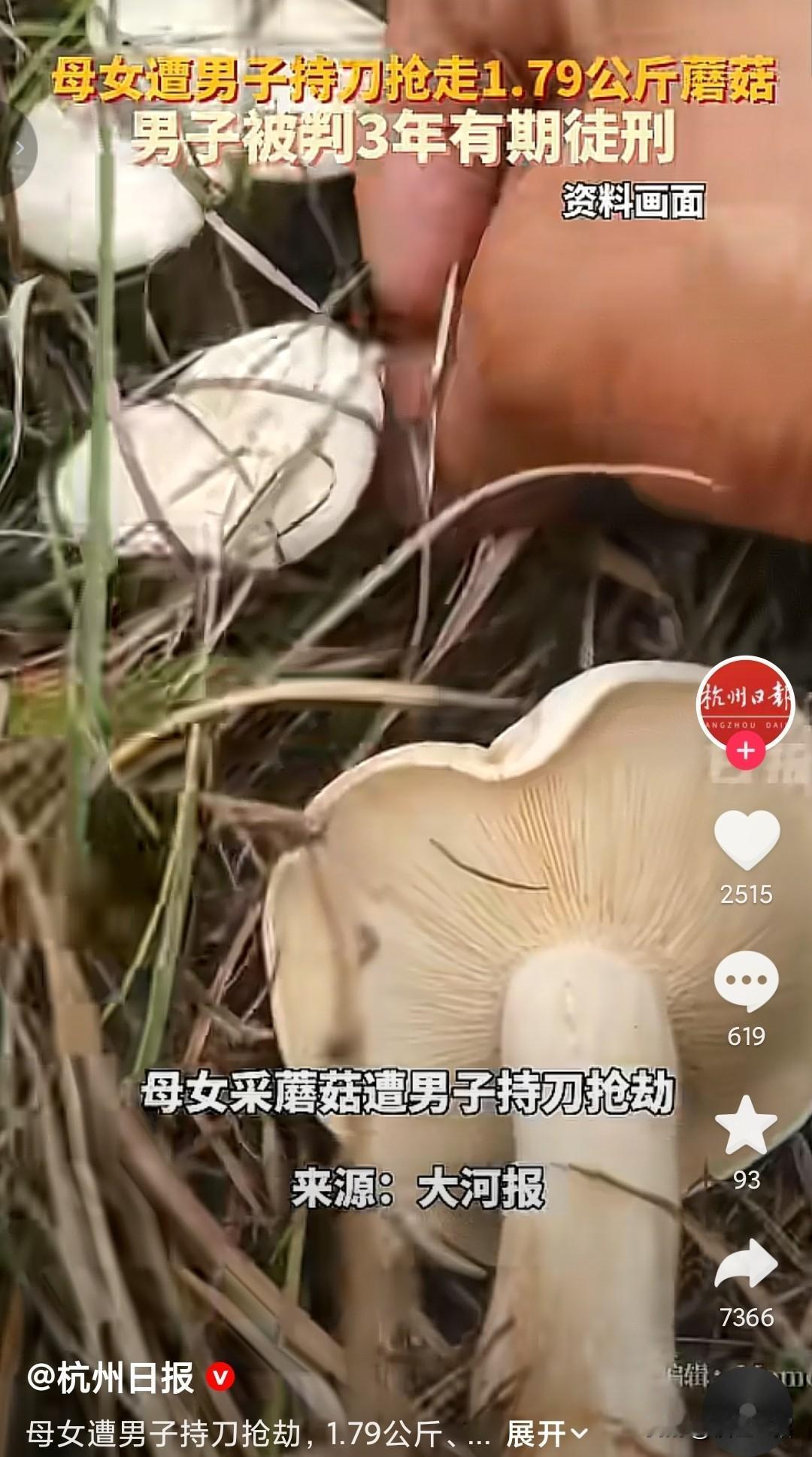 男子因抢1.79公斤蘑菇,被判三年有期徒刑,罚2000元。 他为什么敢持刀,就为了抢那价值不高的蘑菇,无非就是看着她们好欺负,根本就没有意识到,持刀抢劫不在于金额的大小,而在于拿刀抢劫的本身,同时也震慑住有他同样想法的人。 大家关注点都在蘑菇和金钱上面,事实上就是法律知识普及的问题,能发生这种现象的多数都是一些偏远地区或者农村或者上了年纪的人,因为他们的思想还处于谁的拳头大,谁就可以为所欲为,压根没有意识到还有法律这回事。